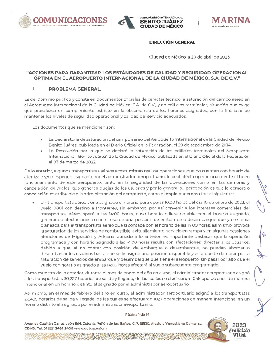 Por lo tanto, si un vuelo no cuenta con horario de salida, la Agencia Federal de Aviación Civil (AFAC) no autorizará el plan de vuelo a la aerolínea, y se le notificará al AICM, a Servicios a la Navegación en el Espacio Aéreo Mexicano (Seneam) y al Coordinador de Horarios de la AFAC.