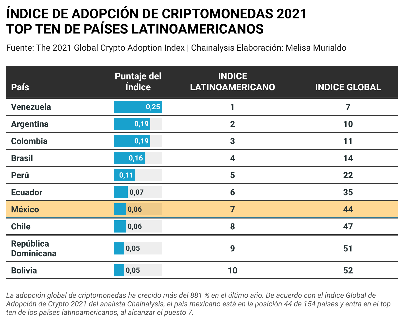 La adopción global de criptomonedas ha crecido más del 881 % en el último año. De acuerdo con el índice Global de adopción de Crypto 2021 del analista Chainalysis, el país mexicano se encuentra en la posición 44 de 154 países y en el séptimo puesto de los países latinoamericanos.