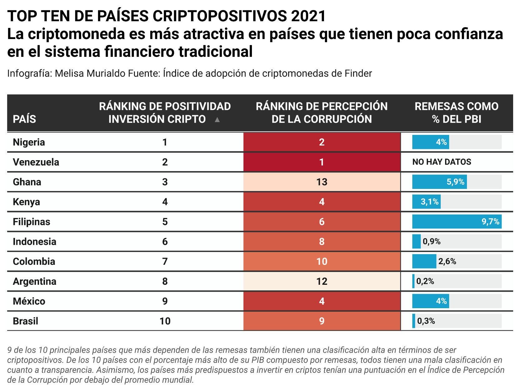 De 10 países más predispuestos a invertir en criptomonedas, 7 de ellos corresponden a los que su economía más depende de sus remesas internacionales y cuyo índice de percepción de la corrupción tiene mala clasificación mundial. En ese grupo se encuentra México.