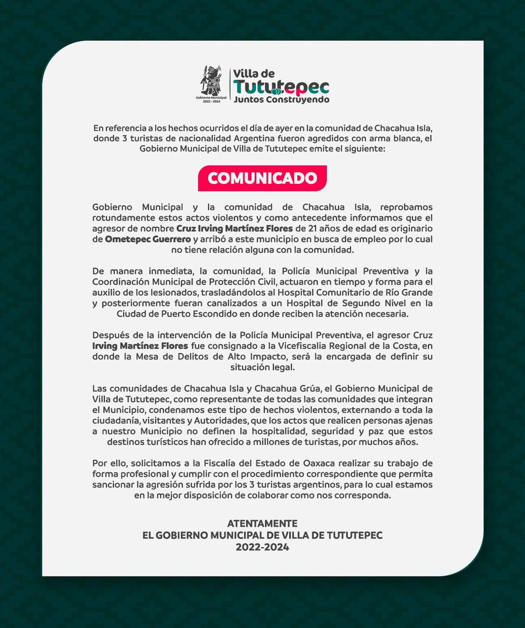 El presunto agresor, identificado por un comunicado del Gobierno de Villa de Tutupec como Cruz Irving Martínez Flores, de 21 años, y originario de Ometepec Guerrero, fue inmediatamente detenido y consignado a la vicefiscalía regional de la Costa, en donde la Mesa de Delitos de Alto Impacto será la encargada de definir su situación legal.