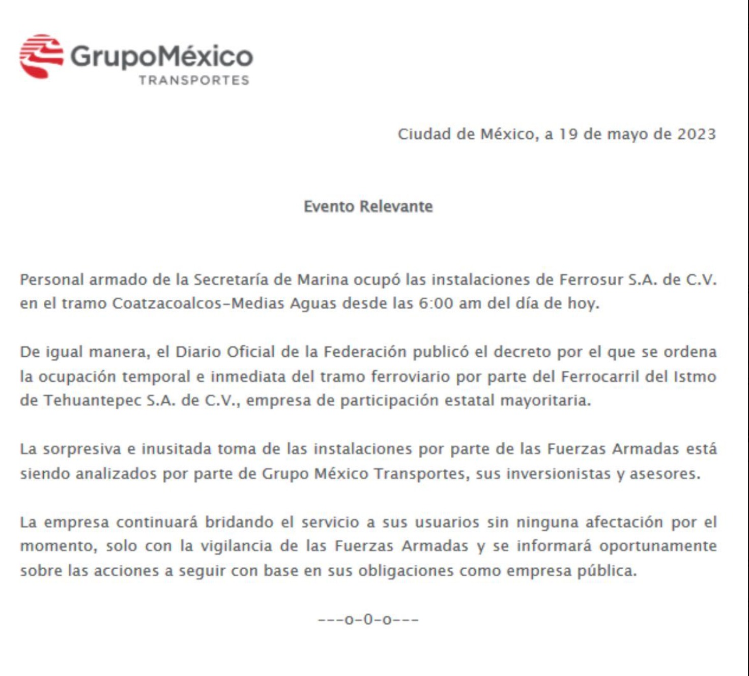 “La sorpresiva e inusitada toma de las instalaciones por parte de las Fuerzas Armadas está siendo analizada por parte de Grupo México Transportes, sus inversionistas y asesores”, indicó Grupo México Transportes de Germán Larrea en un comunicado enviado a la Bolsa Mexicana de Valores (BMV).