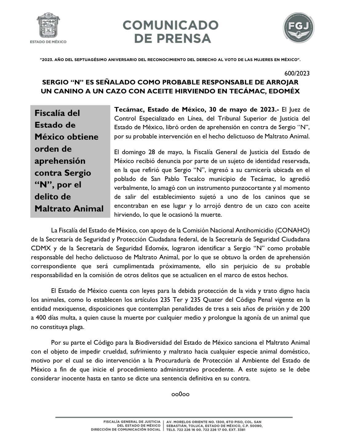 La Fiscalía del Estado de México, con apoyo de la Comisión Nacional Antihomicidio (CONAHO) de la Secretaría de Seguridad y Protección Ciudadana federal, de la Secretaría de Seguridad Ciudadana CDMX y de la Secretaría de Seguridad Edomex, lograron identificar a Sergio “N” como probable responsable del hecho delictuoso de Maltrato Animal, por lo que se obtuvo la orden de aprehensión correspondiente que será cumplimentada próximamente, ello sin perjuicio de su probable responsabilidad en la comisión de otros delitos que se actualicen en el marco de estos hechos.