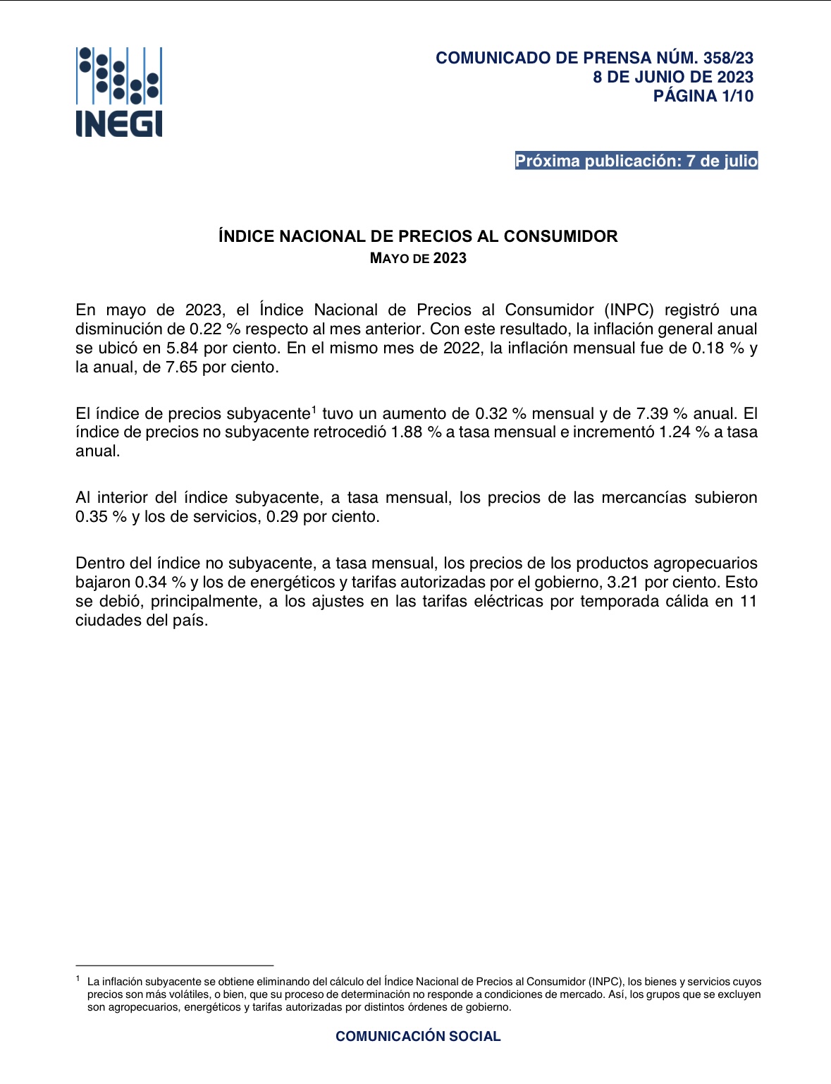 Así se encuentra este jueves la inflación general anual en México se ubicó en 5.84 por ciento en mayo de 2023