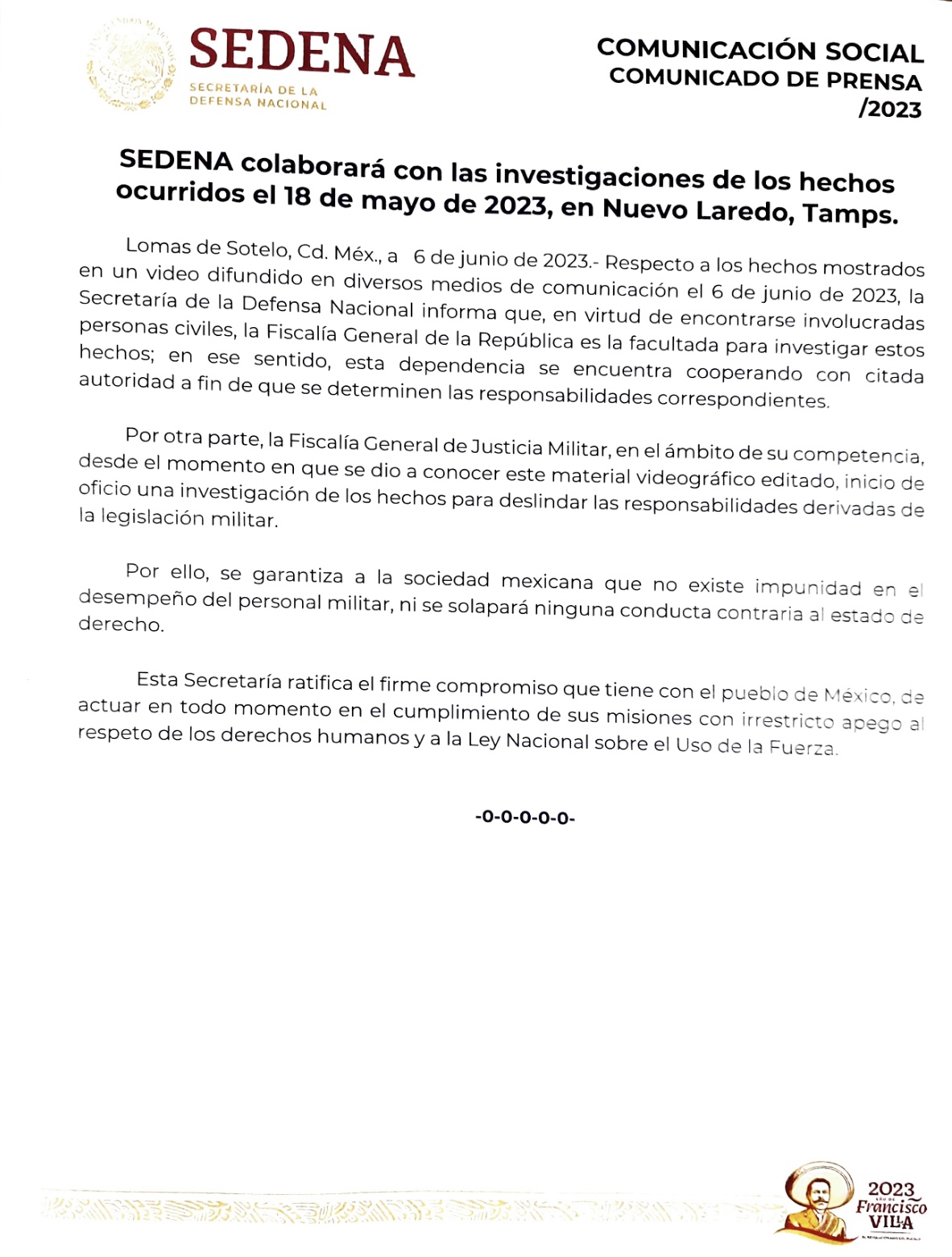 Sobre estos hechos, la Secretaría de la Defensa Nacionalaseguró que la Fiscalía General de la República (FGR) es la facultada para investigar los hechos y que colaborará con las indagatorias que se inicien sobre estos hechos.