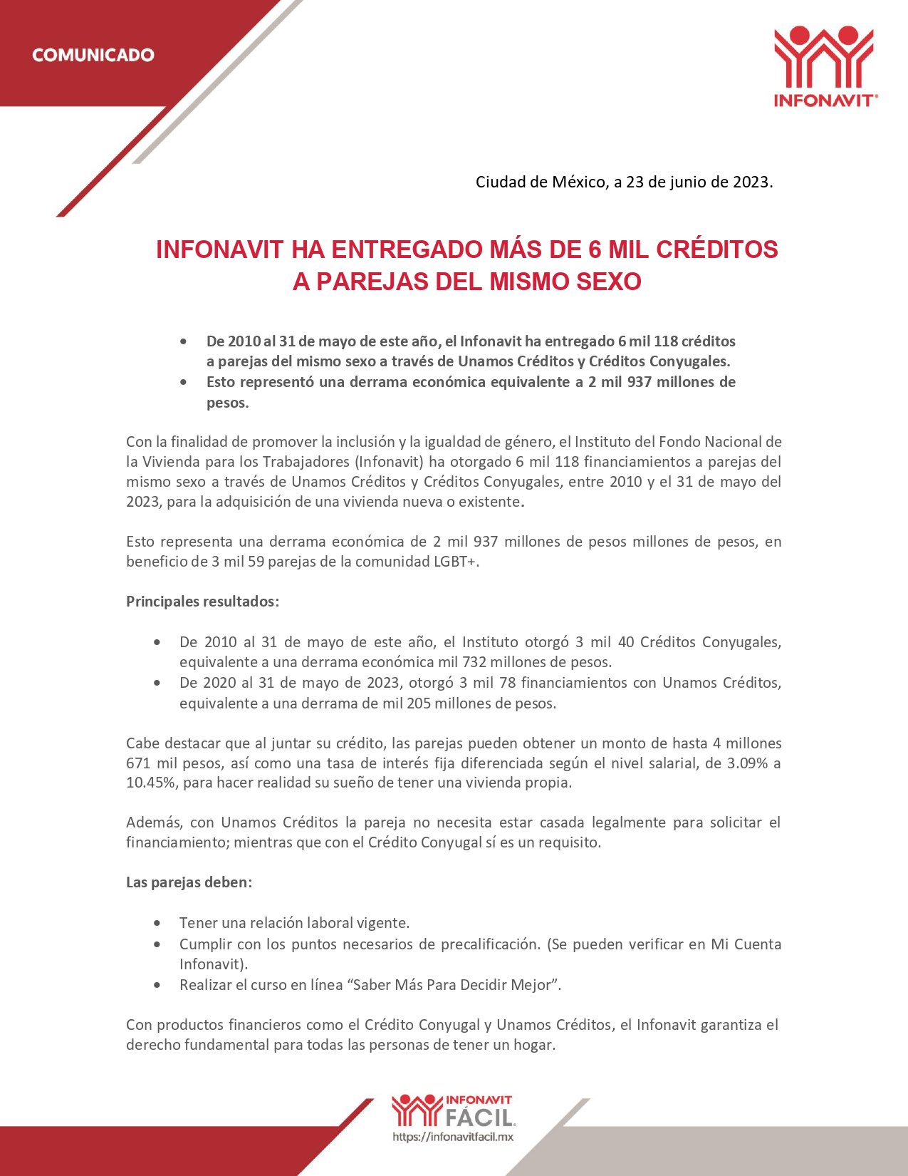 El Infonavit entregó 6 mil 118 créditos a parejas del mismo sexo a través de Unamos Créditos y Créditos Conyugales