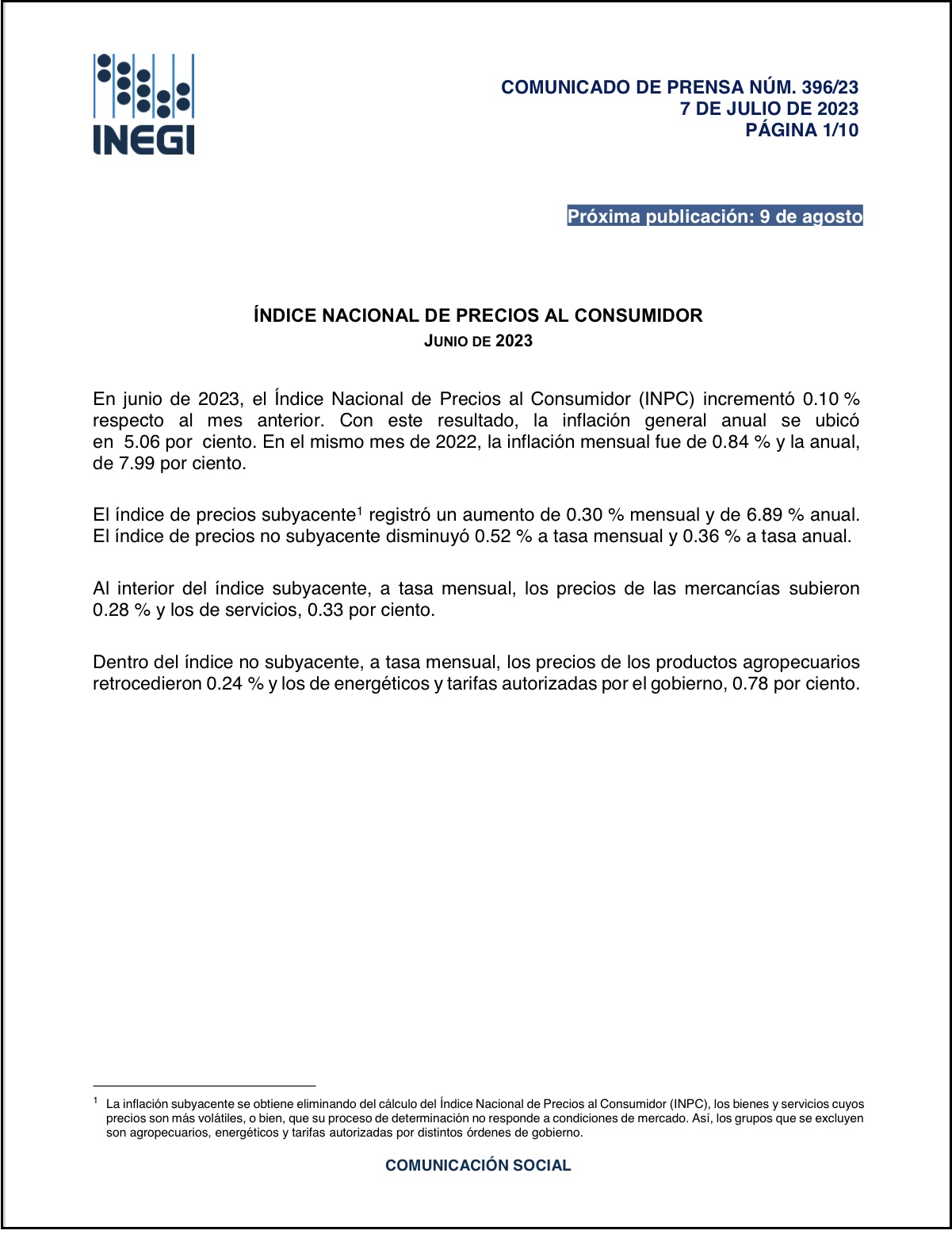 En un comunicado, se explicó que el Índice Nacional de Precios al Consumidor (INPC) incrementó 0.10 por ciento respecto al mes anterior. En el mismo mes de 2022, la inflación mensual fue de 0.84 por ciento y la anual, de 7.99 por ciento.