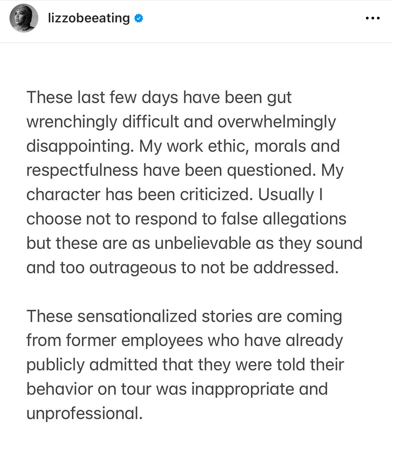 “Mi ética de trabajo, moral y respeto han sido cuestionados”, lamentó la artista, quien agregó que normalmente no suele responder a “alegaciones falsas”, pero que en esta ocasión las acusaciones son tan “increíbles” y “escandalosas” que no quiere dejarlo pasar. “Estas historias sensacionalistas provienen de exempleadas que ya han admitido públicamente que durante la gira se les dijo que su comportamiento era inadecuado y no profesional”, precisó Lizzo.