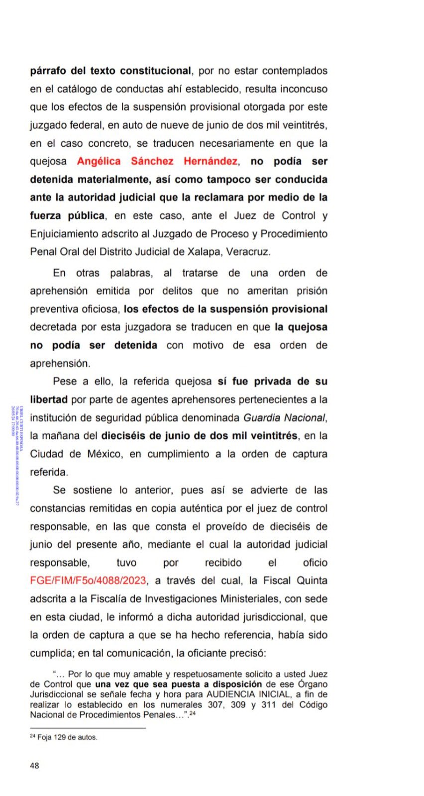 “Es evidente que la suspensión provisional solo la protegía contra actos emitidos hasta la fecha de la presentación de su demanda de amparo, es decir antes del 9 de junio de 2023, y no contra aquellos actos que fueran dictados con posterioridad al otorgamiento de la suspensión, como lo es la orden de aprehensión ejecutada, que fue emitida el 16 de junio de 2023”, dijo.