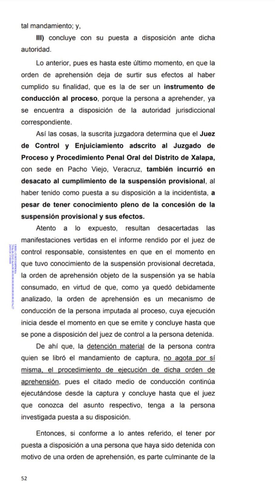 En una sentencia, se apuntó que la jueza veracruzana no podía ser detenida debido a que contaba con una suspensión provisional, así como tampoco podía ser conducida ante la autoridad judicial que la reclamara por medio de la fuerza pública.