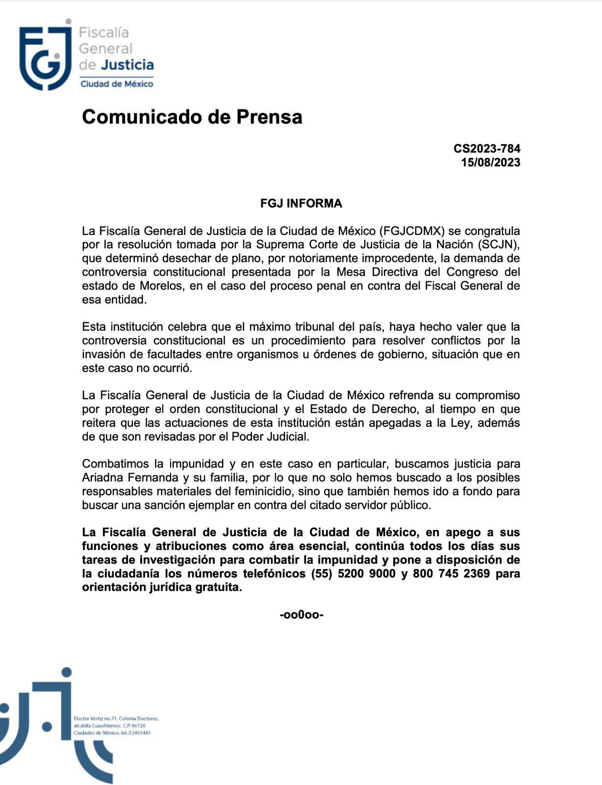 Combatimos la impunidad y en este caso en particular, buscamos justicia para Ariadna Fernanda y su familia, por lo que no solo hemos buscado a los posibles responsables materiales del feminicidio, sino que también hemos ido a fondo para buscar una sanción ejemplar en contra del citado servidor público”, manifestó.