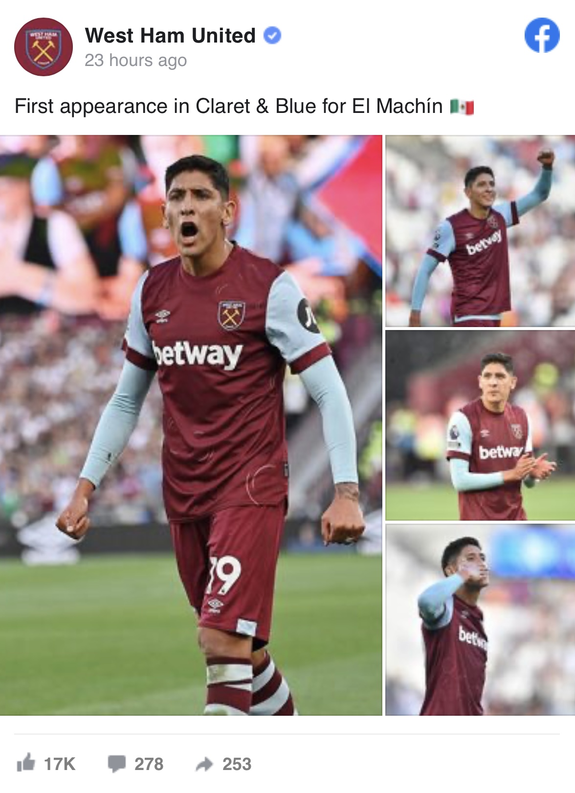 El centrocampista mexicano disputó los últimos diez minutos en la victoria del West Ham por 3-1 ante el Chelsea en el Estadio Olímpico de Londres.