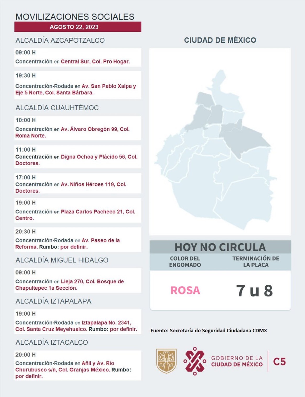 De acuerdo con el Centro de Comando, Control, Cómputo, Comunicaciones y Contacto Ciudadano de la Ciudad de México (C5) este 22 de agosto se esperan 10 marchas y concentraciones a lo largo del día, las cuales podrían afectar la circulación en vialidades de la capital.