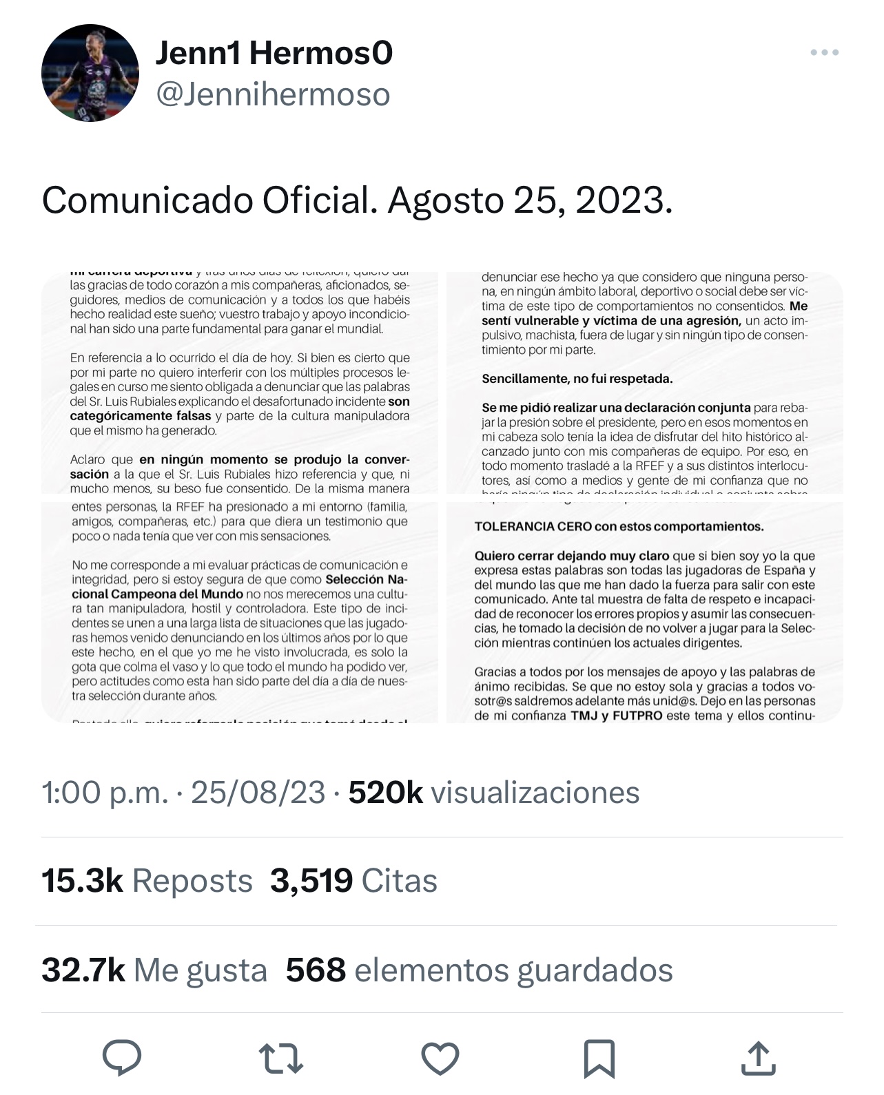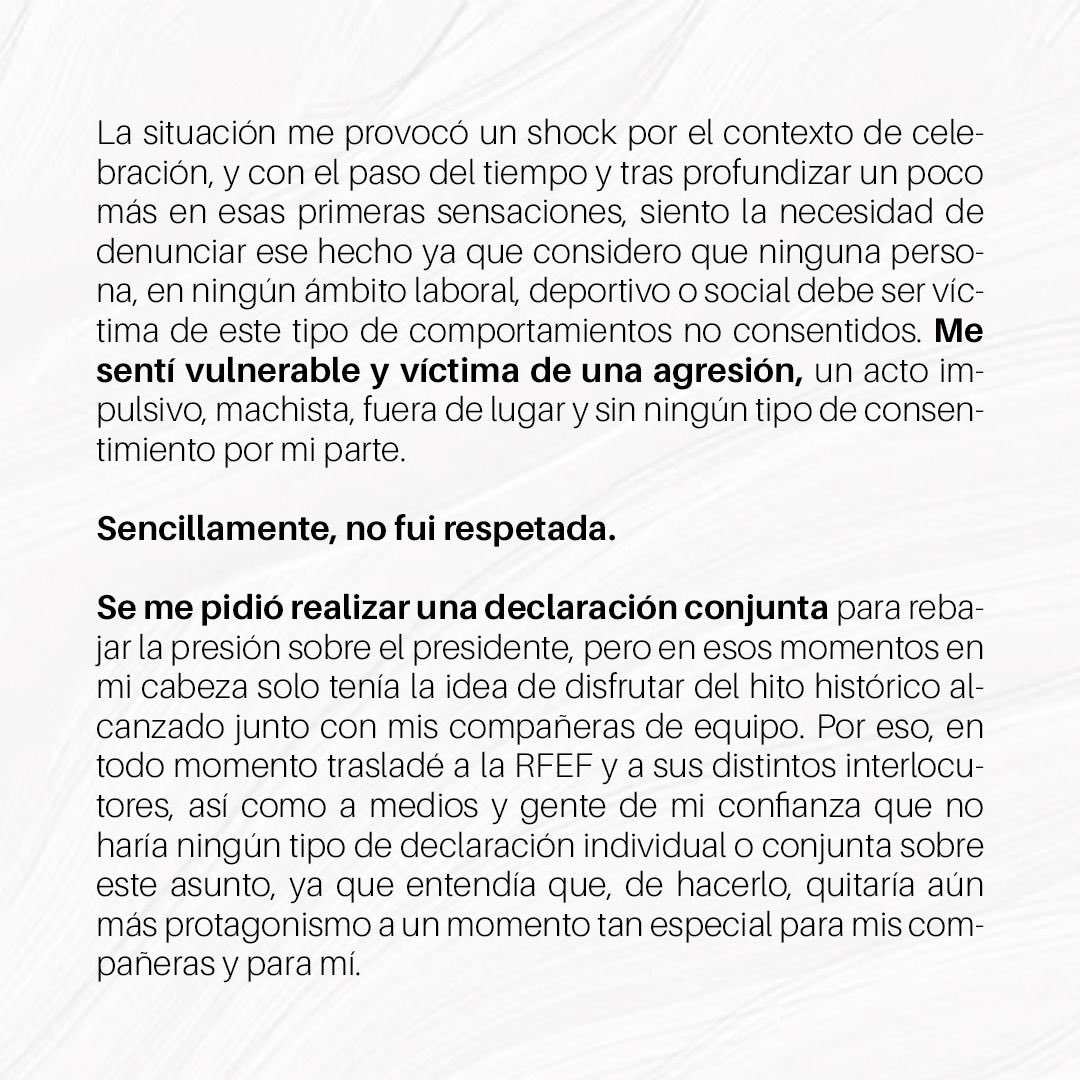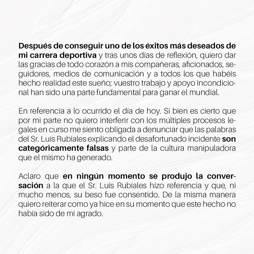 Quiero aclarar que en ningún momento consentí el beso que me propinó y en ningún caso busqué alzar al presidente. No tolero que se ponga en duda mi palabra y mucho menos que se inventen palabras que no he dicho”, asegura Jenni Hermoso en un comunicado.