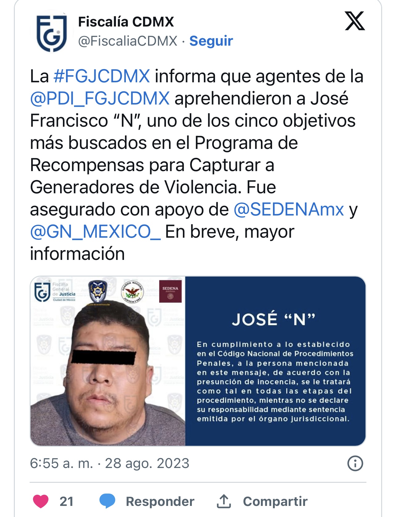 Hasta el momento se desconoce si fue a través de la recompensa que se logró su detención, misma que fue realizada en coordinación con la Secretaría de la Defensa Nacional (Sedena) y la Guardia Nacional.