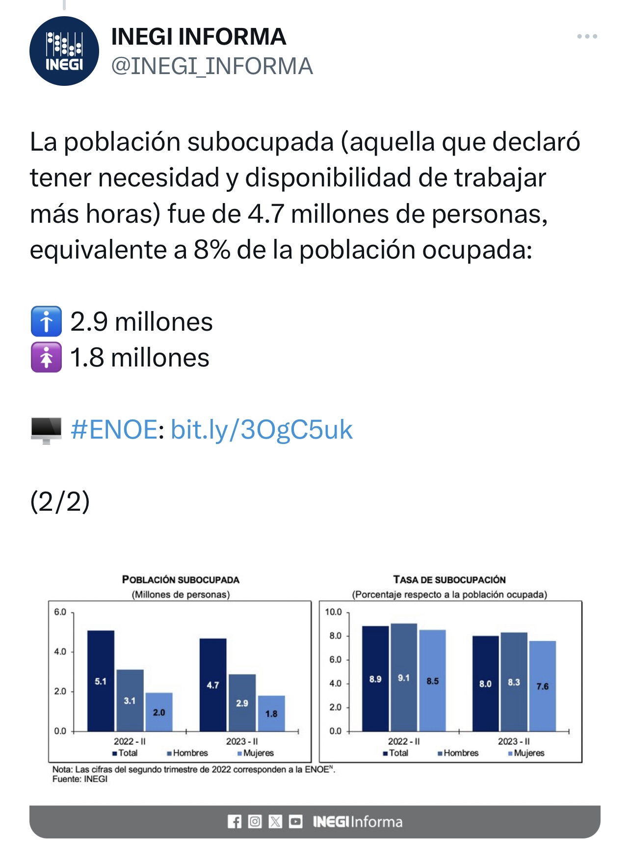 Aún así, 1.7 millones de personas permanecieron desocupadas y 4.7 millones de personas estuvieron subocupadas, es decir, que reportaron tener la necesidad y voluntad de trabajar más horas.
