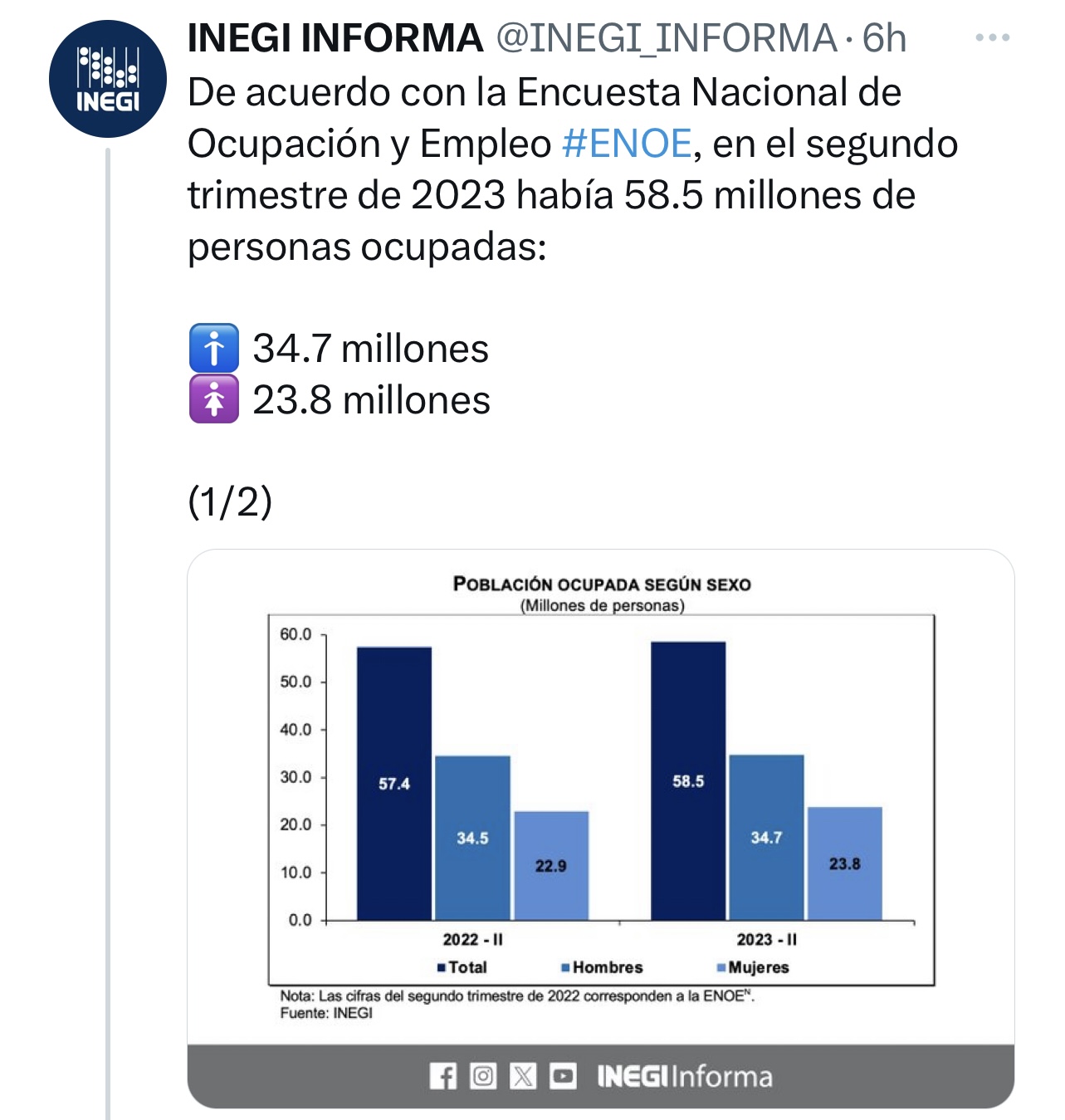 “Un total de 58.5 millones de personas se encontraban ocupadas: 1.1 millones de personas más en relación con el segundo trimestre de 2022″, indicó el organismo autónomo en un reporte.