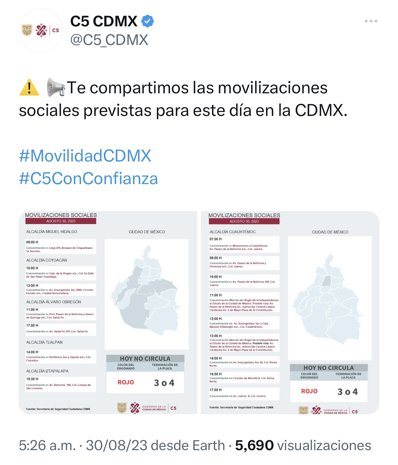 De acuerdo con el Centro de Comando, Control, Cómputo, Comunicaciones y Contacto Ciudadano de la Ciudad de México (C5) este 30 de agosto se esperan 16 marchas y concentraciones a lo largo del día, las cuales podrían afectar la circulación en vialidades de la capital.