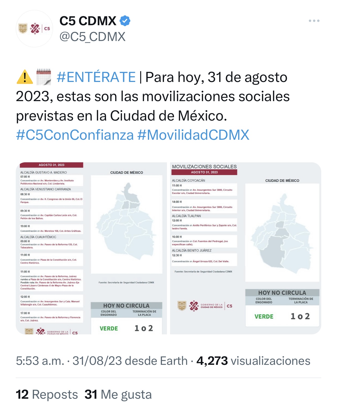 De acuerdo con el Centro de Comando, Control, Cómputo, Comunicaciones y Contacto Ciudadano de la Ciudad de México (C5) este 31 de agosto se esperan 14 marchas y concentraciones a lo largo del día, las cuales podrían afectar la circulación en vialidades de la capital.