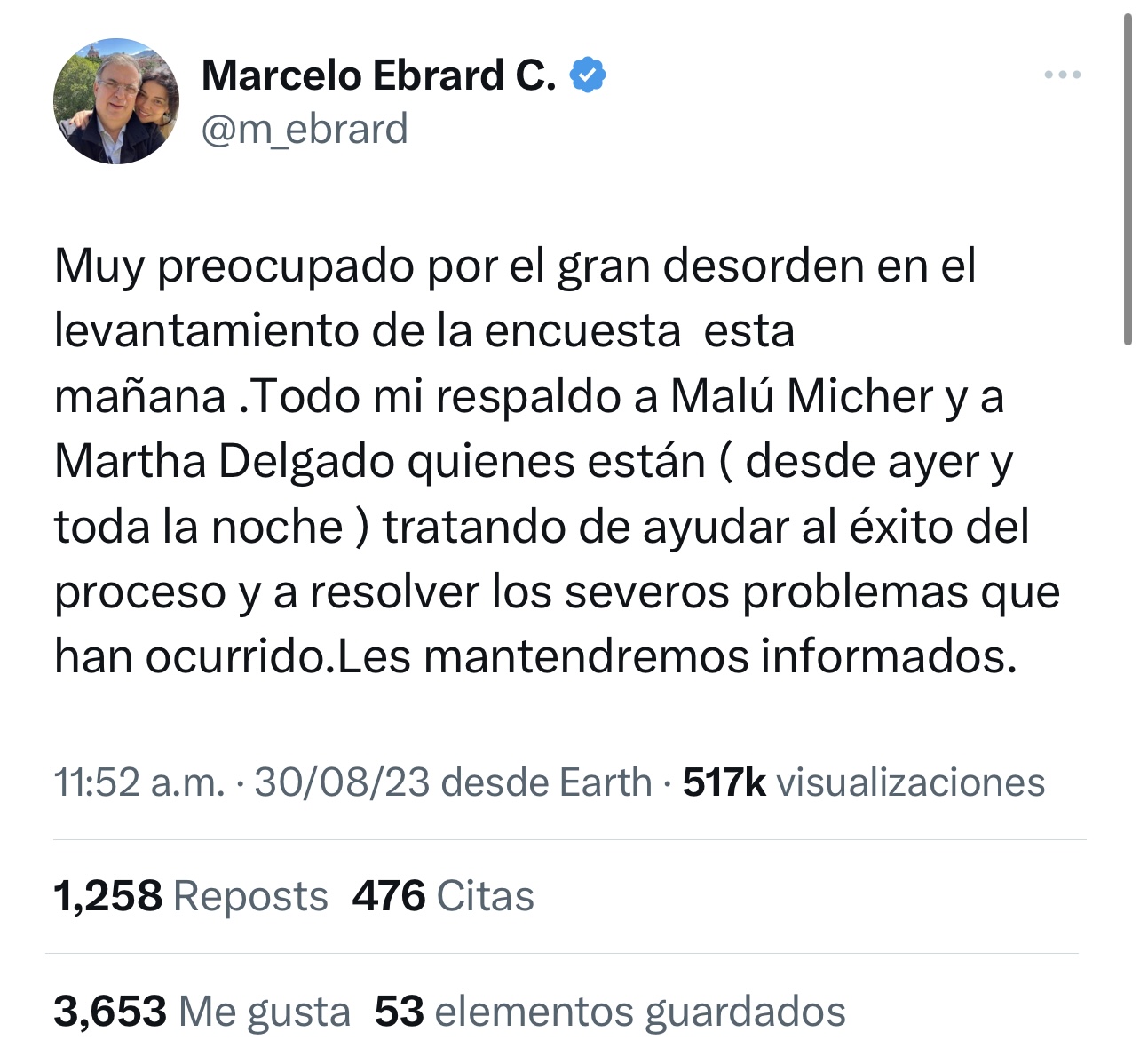 Muy preocupado por el gran desorden en el levantamiento de la encuesta esta mañana”, escribió Ebrard en la red social X (antes Twitter).