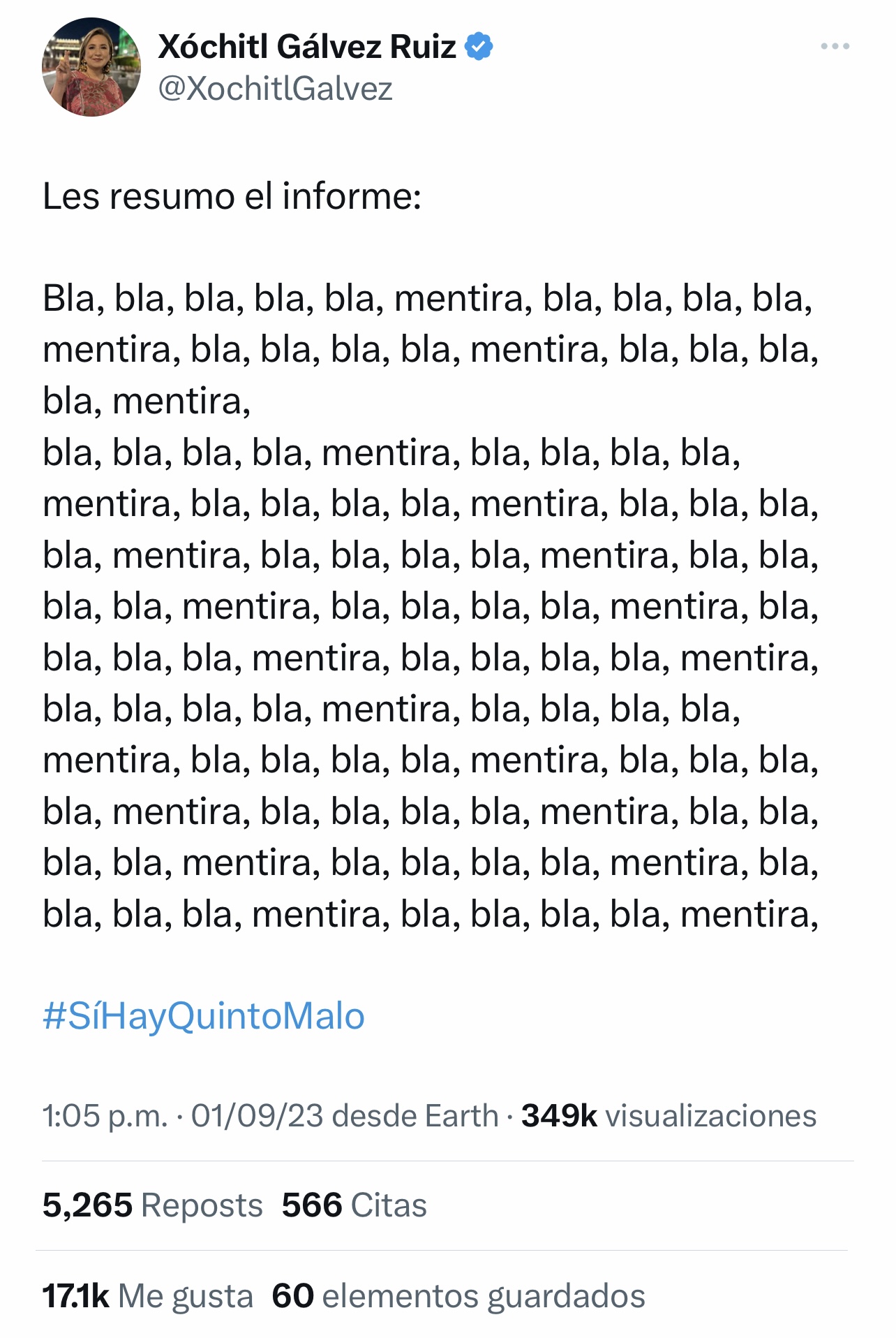 A través de sus redes sociales la aspirante a la presidencia de México por parte de la oposición, Xóchitl Gálvez, se burló del Quinto Informe de Gobierno de Andrés Manuel López Obrador.