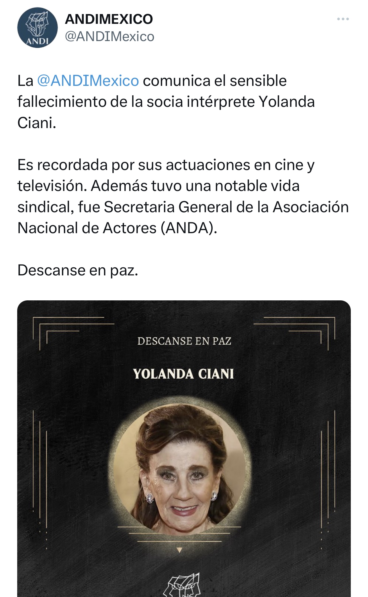 Yolanda Ciani, reconocida actriz de la época de oro del cine mexicano murió a los 85 años de edad.