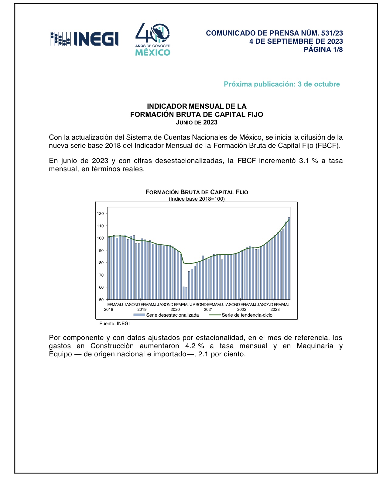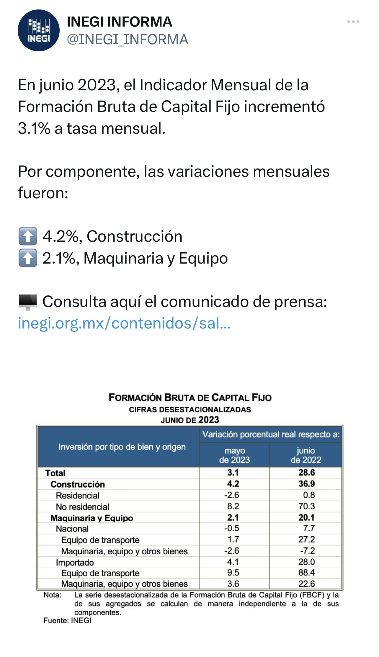 Al contemplar solo junio, la inversión fija bruta creció un 28.8 por ciento interanual por el alza de construcción (37,1 % ) y de la maquinaria y equipo (20.5 %).