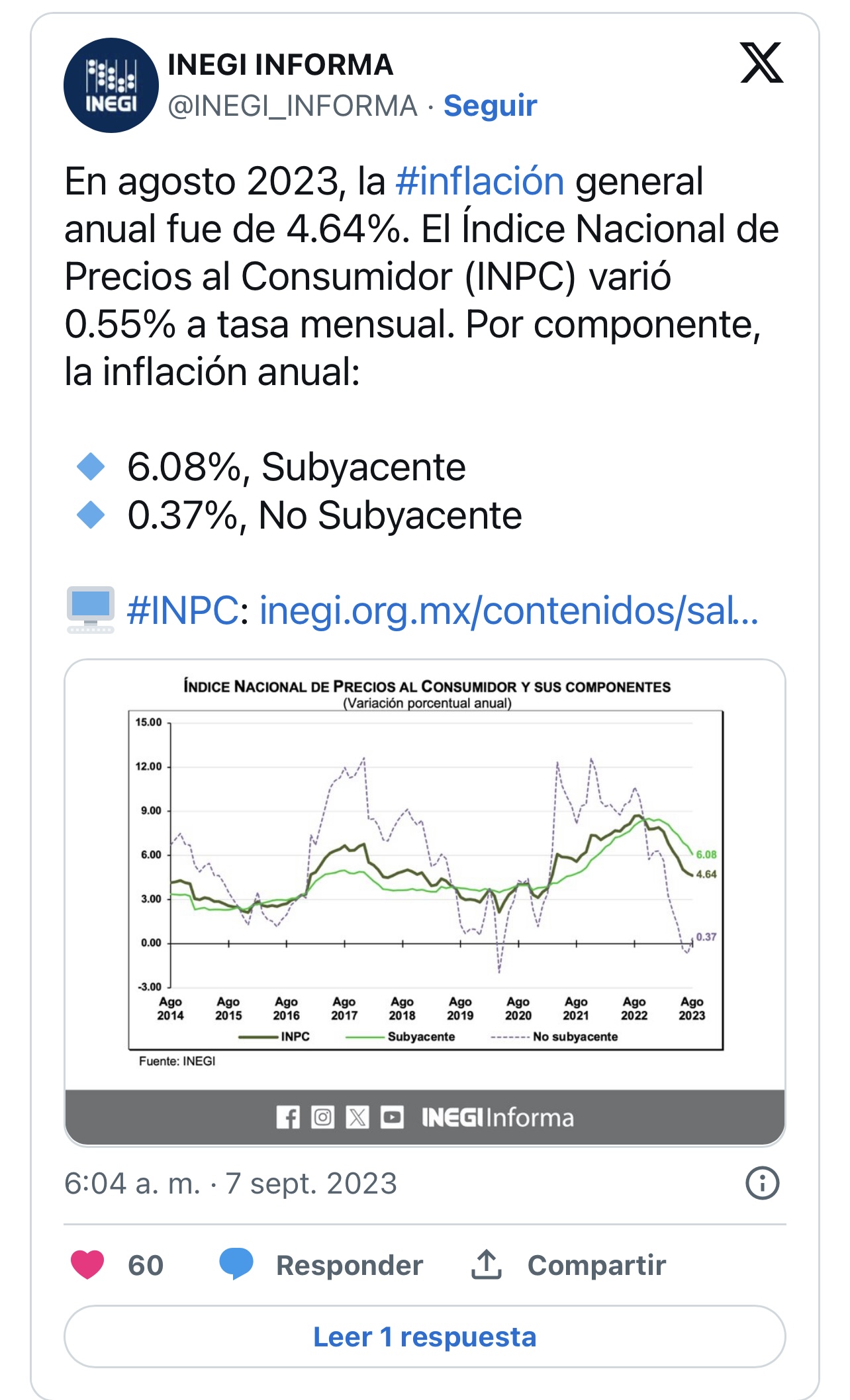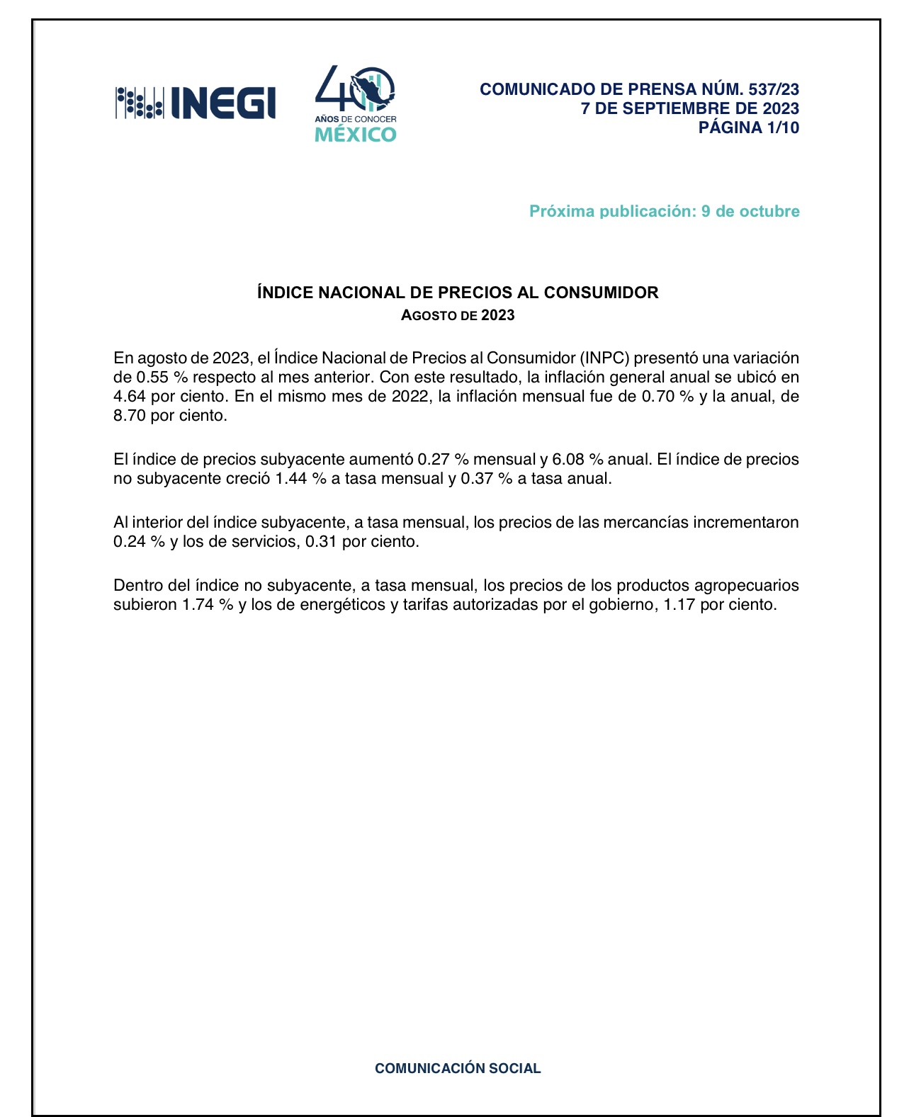 INEGI reveló que la inflación general anual en México se ubicó en 4.64 por ciento en el mes de agosto de 2023