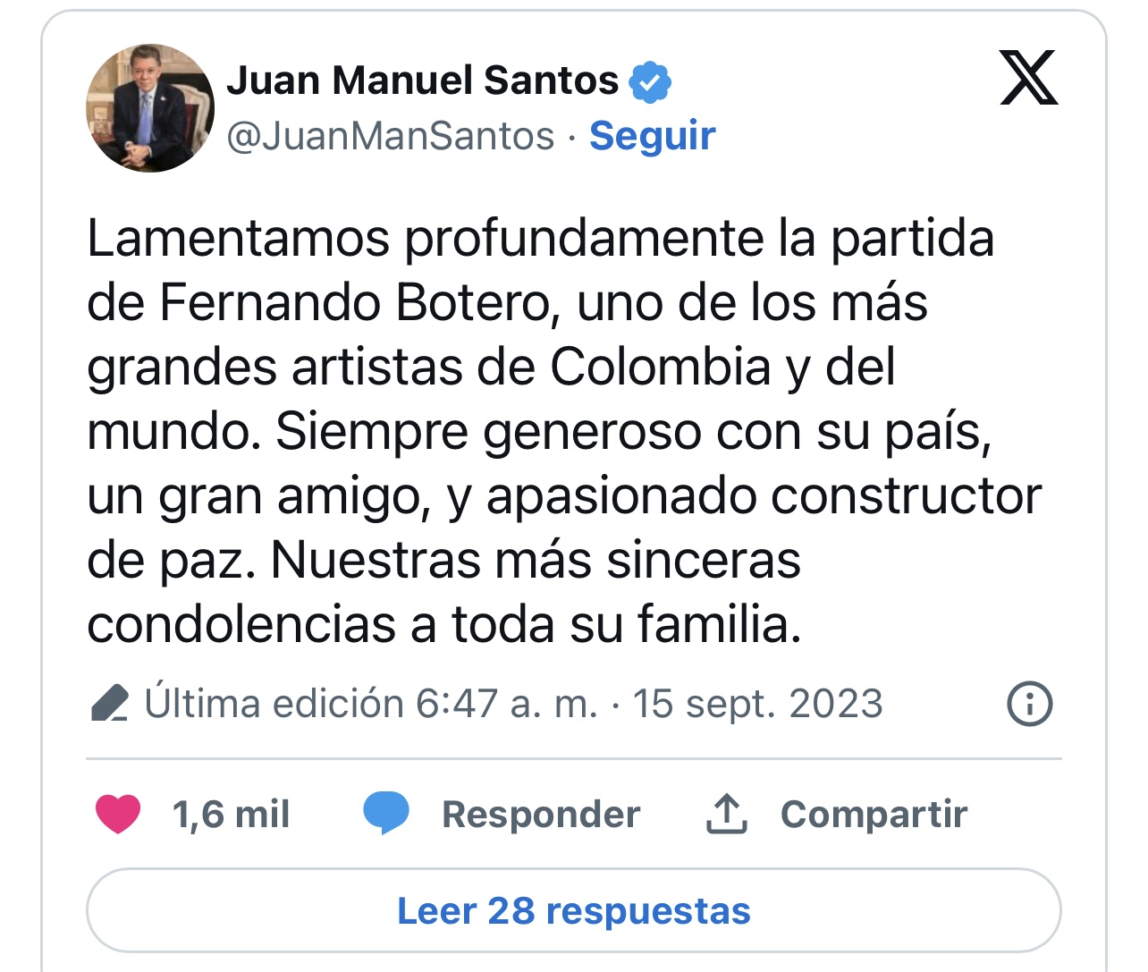 “Lamentamos profundamente la partida de Fernando Botero, uno de los más grandes artistas de Colombia y del mundo. Siempre generoso con su país, un gran amigo, y apasionado constructor de paz. Nuestras más sinceras condolencias a toda su familia”, manifestó en redes sociales el expresidente colombiano, Juan Manuel Santos.
