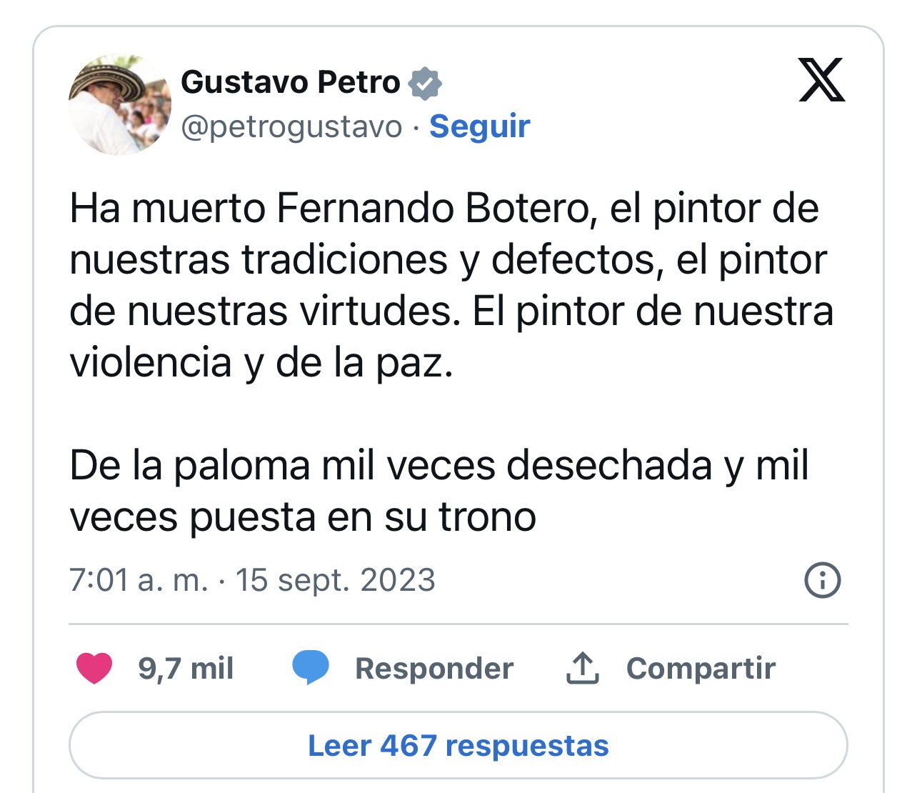 “Ha muerto Fernando Botero, el pintor de nuestras tradiciones y defectos, el pintor de nuestras virtudes. El pintor de nuestra violencia y de la paz. De la paloma mil veces desechada y mil veces puesta en su trono”, manifestó en redes sociales el presidente colombiano, Gustavo Petro, haciendo alusión a la paloma que se exhibe en la Casa Nariño (sede presidencial) y que el artista regaló para conmemorar el acuerdo con las FARC de 2016.