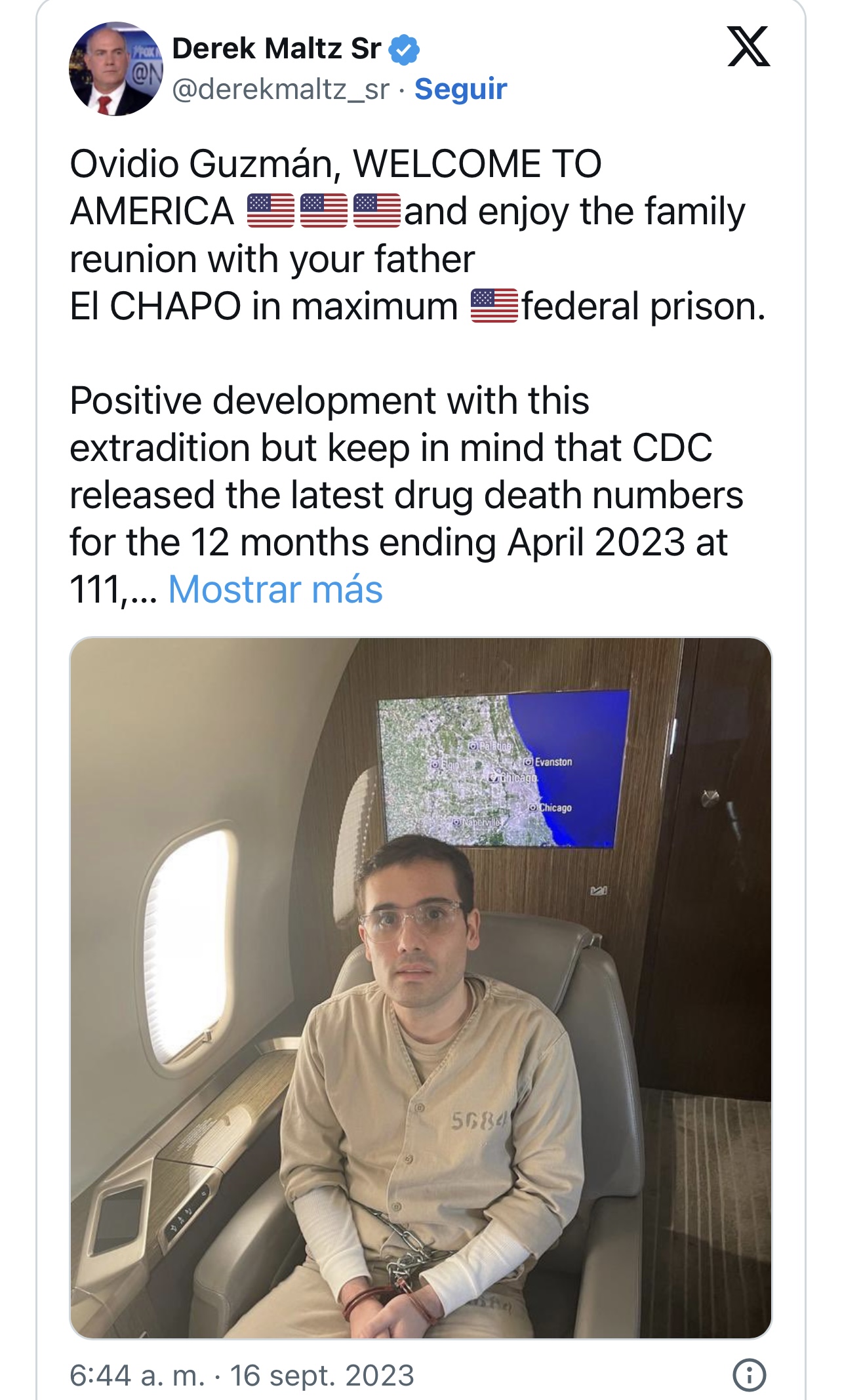 “Ovidio Guzmán, BIENVENIDO A AMÉRICA y disfruta la reunión familiar con tu padre El CHAPO en máxima prisión ????????federal”,escribió el funcionario estadounidense.
