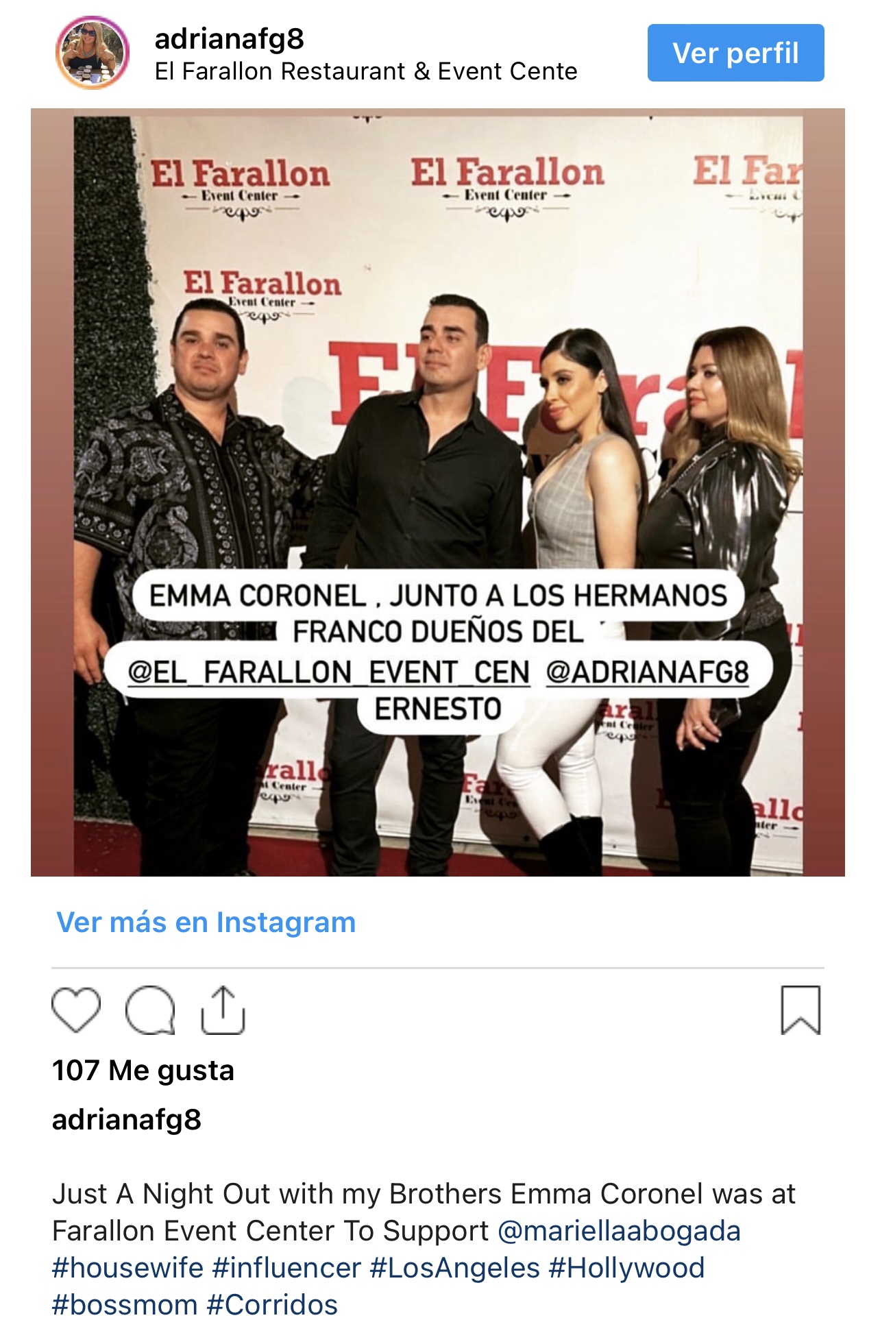 En las fotos publicadas se puede observar a Emma Coronel vistiendo pantalón blanco, blusa tipo chaleco color gris y botas color negro. En un video se puede apreciar como la esposa de “El Chapo” observa sentada en un sillón a Mariel Colón cantar la canción “JGL”, dedicada al fundador del Cártel de Sinaloa.