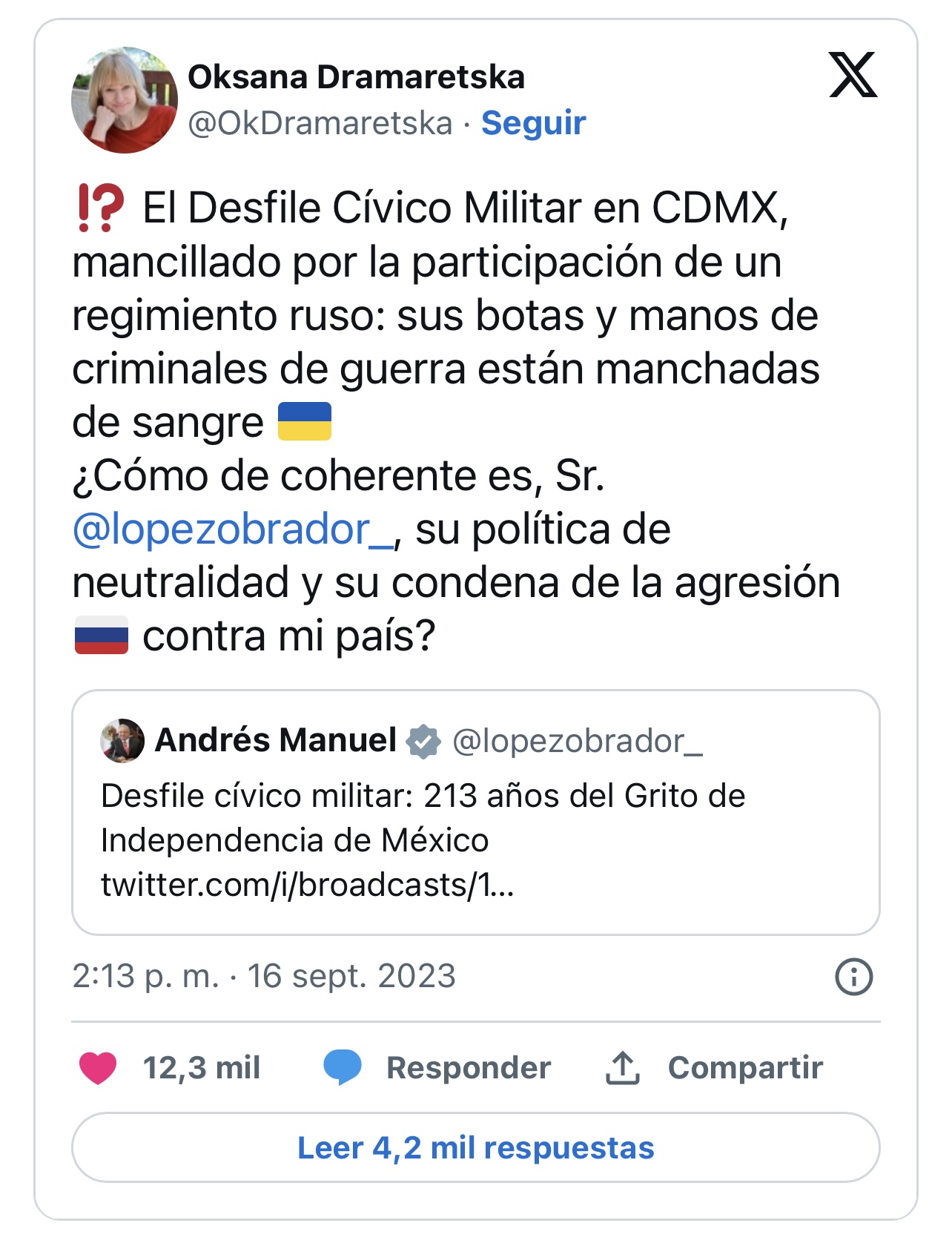 Oksana Dramaretska, embajadora de Ucrania en México, reclamó al presidente Andrés Manuel López Obrador la participación de un contingente del Ejército ruso en el desfile cívico militar