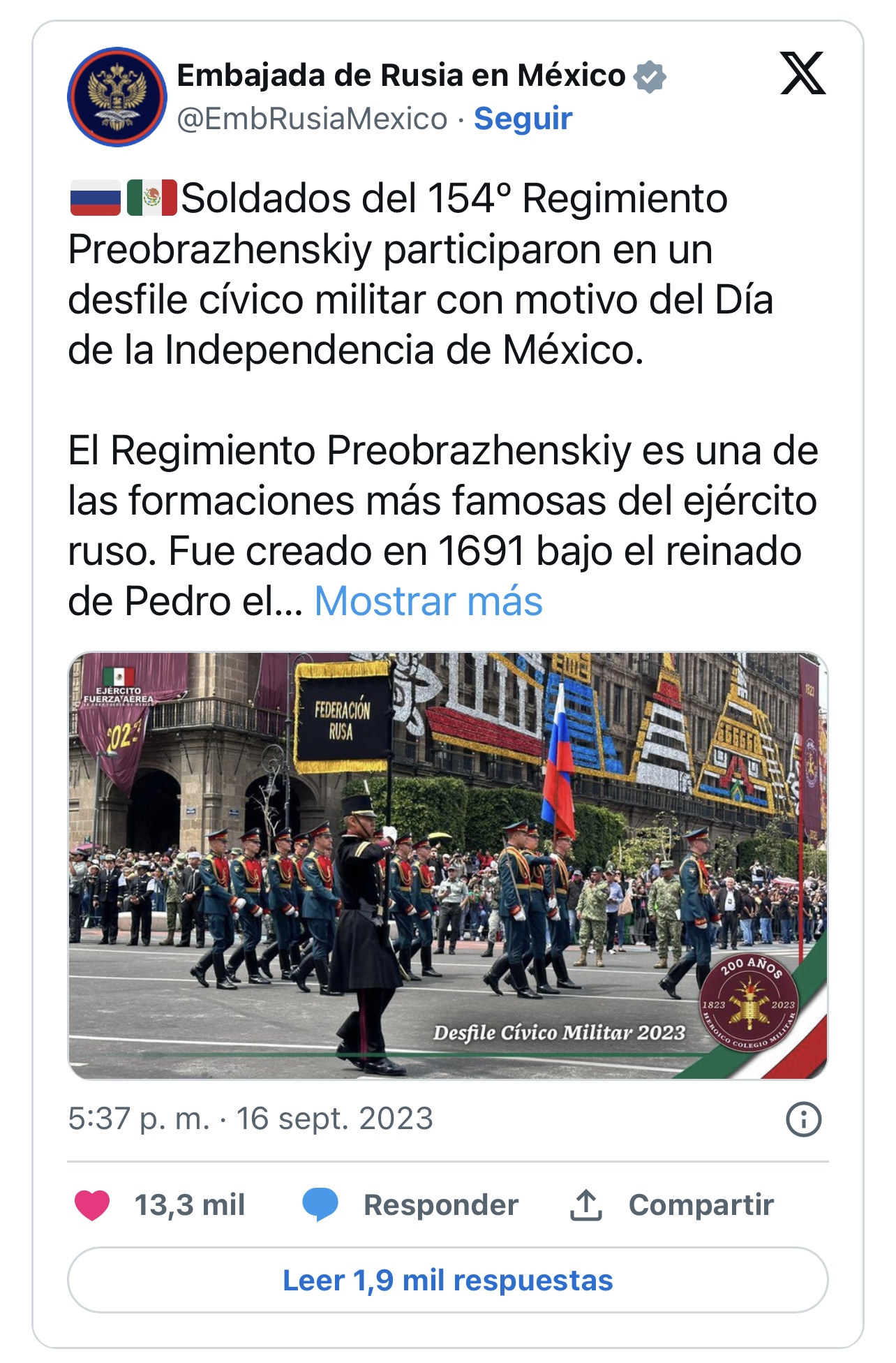 “El Regimiento Preobrazhenskiy es una de las formaciones más famosas del ejército ruso. Fue creado en 1691 bajo el reinado de Pedro el Grande. Es un honor participar en un evento tan importante para el pueblo mexicano. ¡Viva la amistad entre México y Rusia! ¡Viva México!”, apuntó en redes sociales.