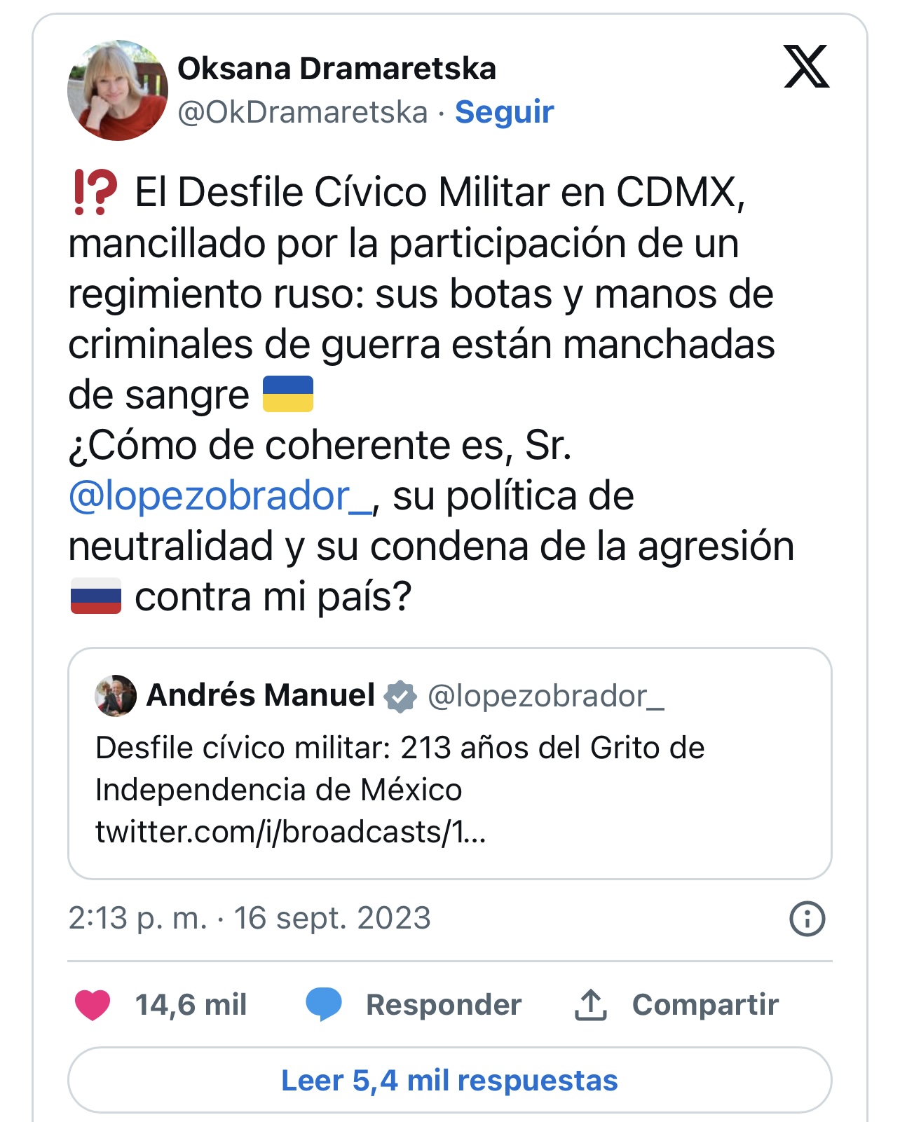 Dramaretska cuestionó al gobernante mexicano sobre la decisión de permitir que los soldados rusos participaran en el desfile de este 16 de septiembre.