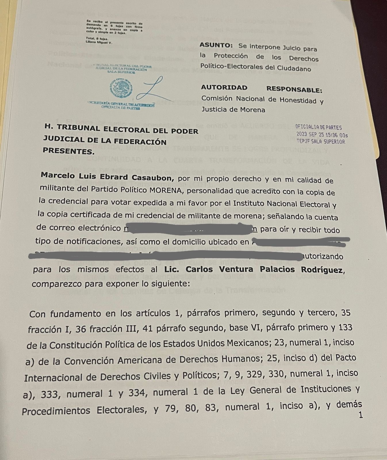 En el escrito se pide ordenar a la Comisión Nacional de Honestidad y Justicia de Morena que admita la demanda de nulidad y posterior reposición del proceso interno para la elección de la Coordinación de Defensa de la Transformación.