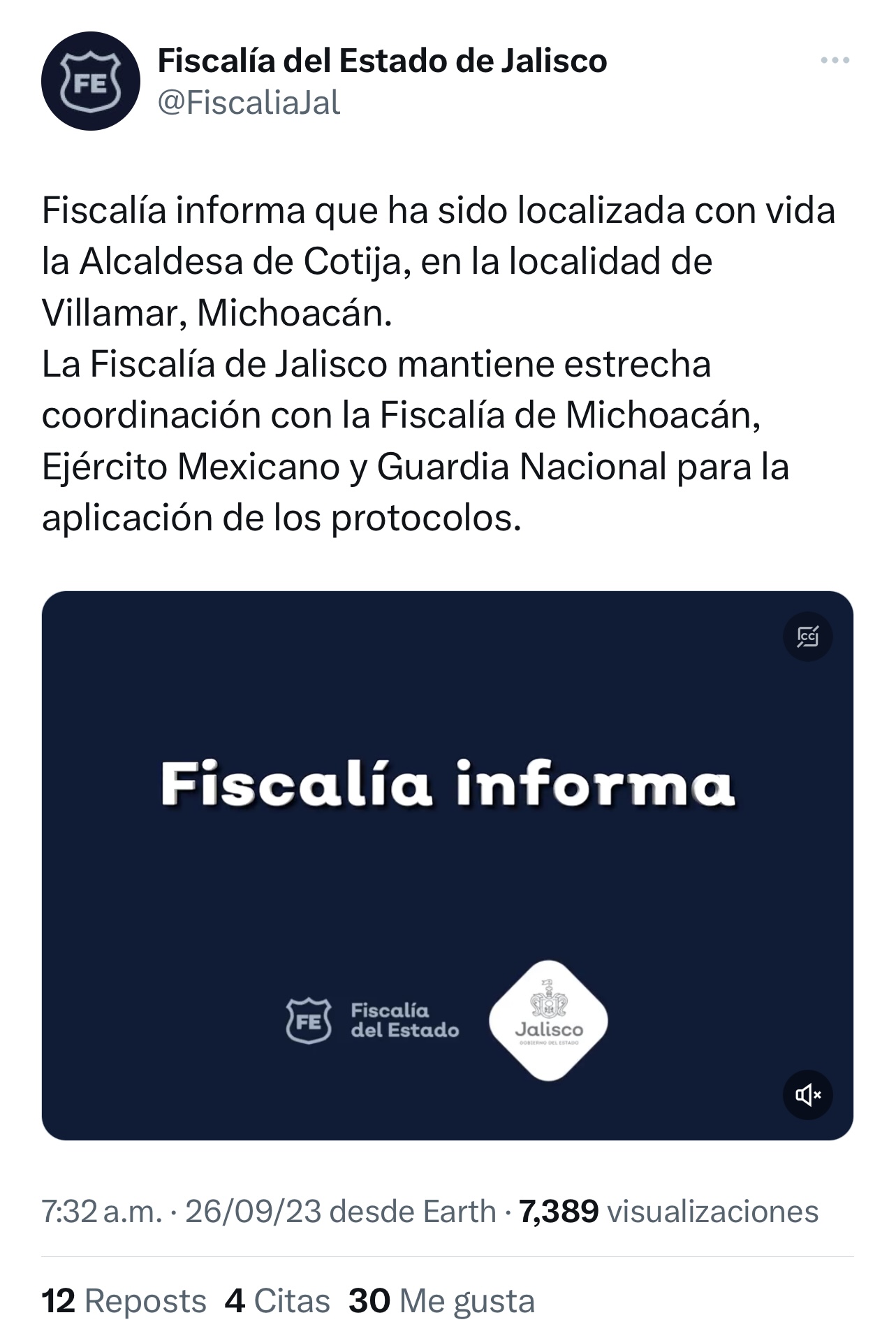 La Fiscalía de Jalisco detalló que la alcaldesa de Cotija fue localizada con vida y en aparente buen estado de salud en el municipio michoacano de Villamar