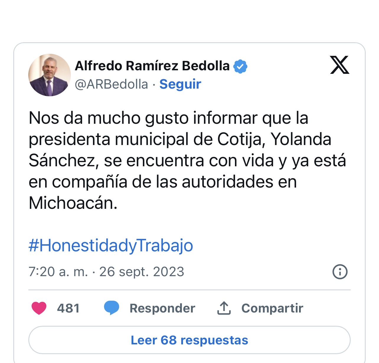 El gobernador de Michoacán, Alfredo Ramírez Bedolla, informó la localización con vida de la presidenta municipal, quien dijo, ya está en compañía de autoridades.
