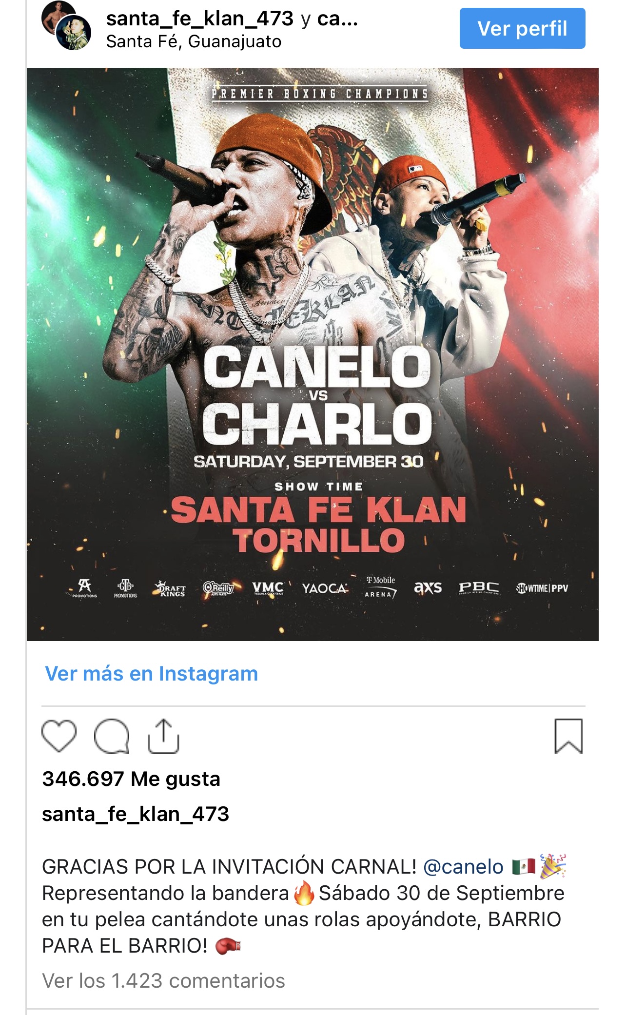 “Gracias por la invitación carnal. Representando la bandera. Sábado 30 de Septiembre en tu pelea cantándote unas rolas apoyándote, ¡Barrio para el barrio!”, escribió el rapero en su cuenta de instagram. Momentos más tarde, el boxeador respondió al mensaje del rapero.