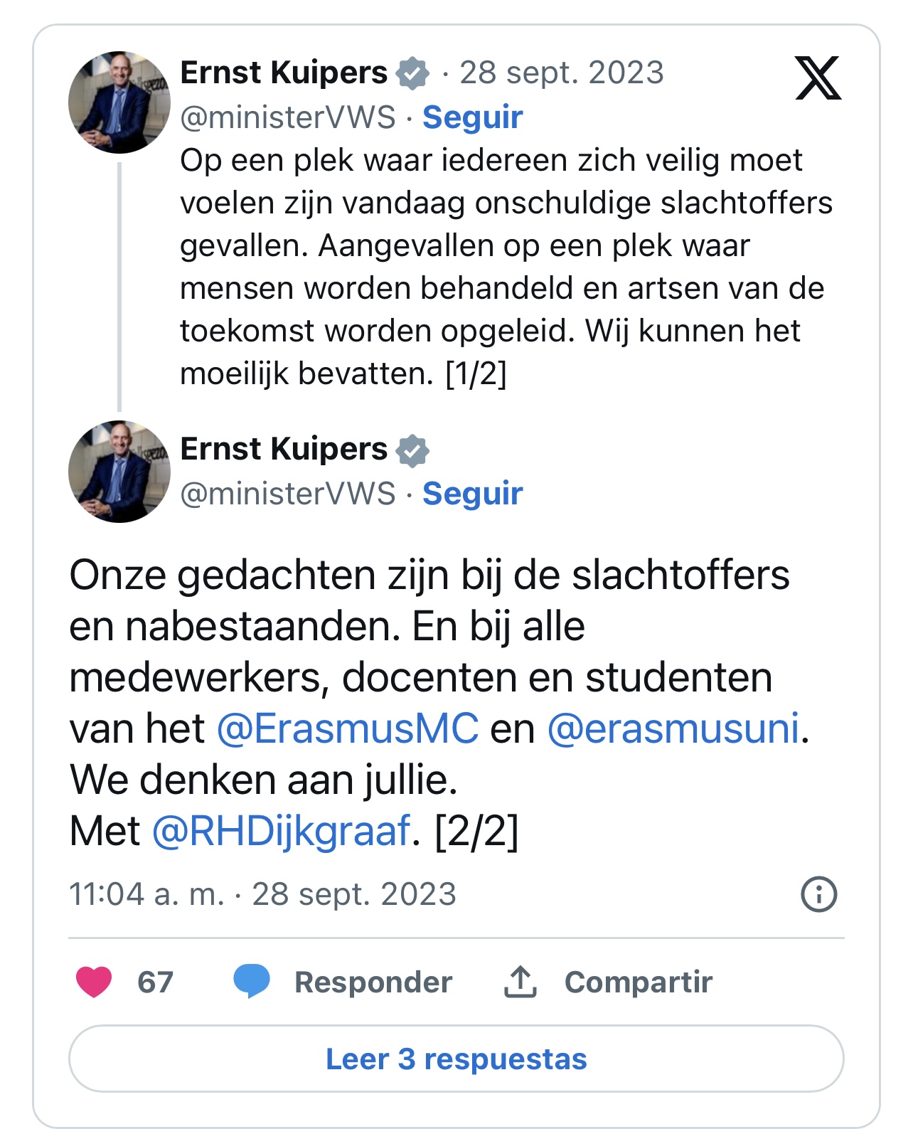 El ministro saliente de Sanidad, Ernst Kuipers, manifestó estar siguiendo la situación muy de cerca y expresó su “empatía” con las víctimas.