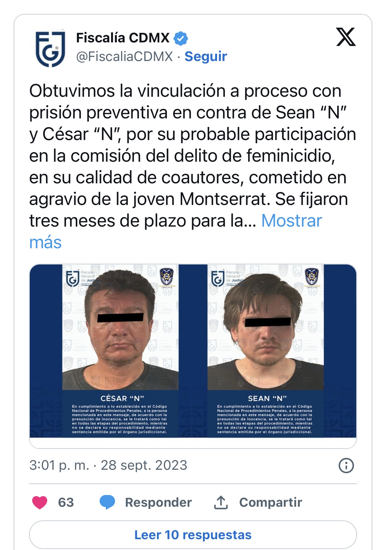 Un juez vinculó a proceso a Sean “N” y César “N” por su presunta responsabilidad en el delito de feminicidio, perpetrado en agravio de la joven Montserrat Juárez en la alcaldía Miguel Hidalgo de la Ciudad de México.