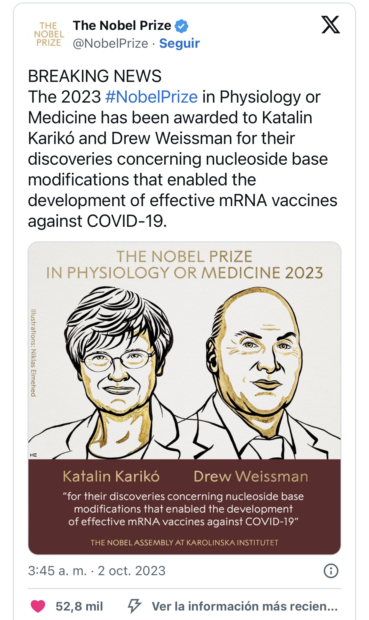 Internacionales///Carolina Alonso Romei///El Premio Nobel de Medicina o Fisiología 2023 es para Katalin Karikó y Drew Weissman por sus investigaciones relacionadas con las vacunas ARN mensajero contra el COVID-19