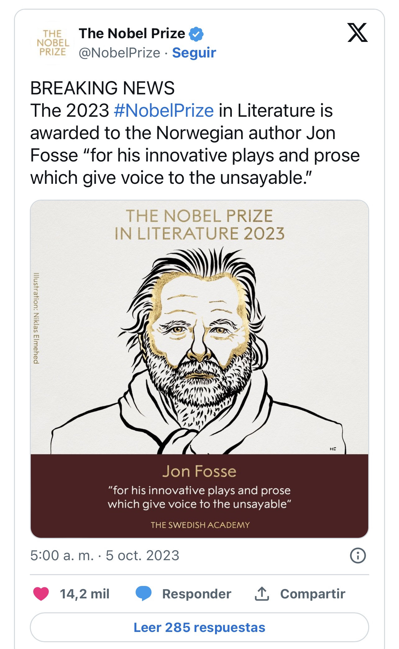 El autor noruego Jon Fosse obtuvo el Premio Nobel de Literatura de 2023 “por sus innovadoras obras de teatro y su prosa que dan voz a lo inefable”, anunció hoy la Academia Sueca en Estocolmo.
