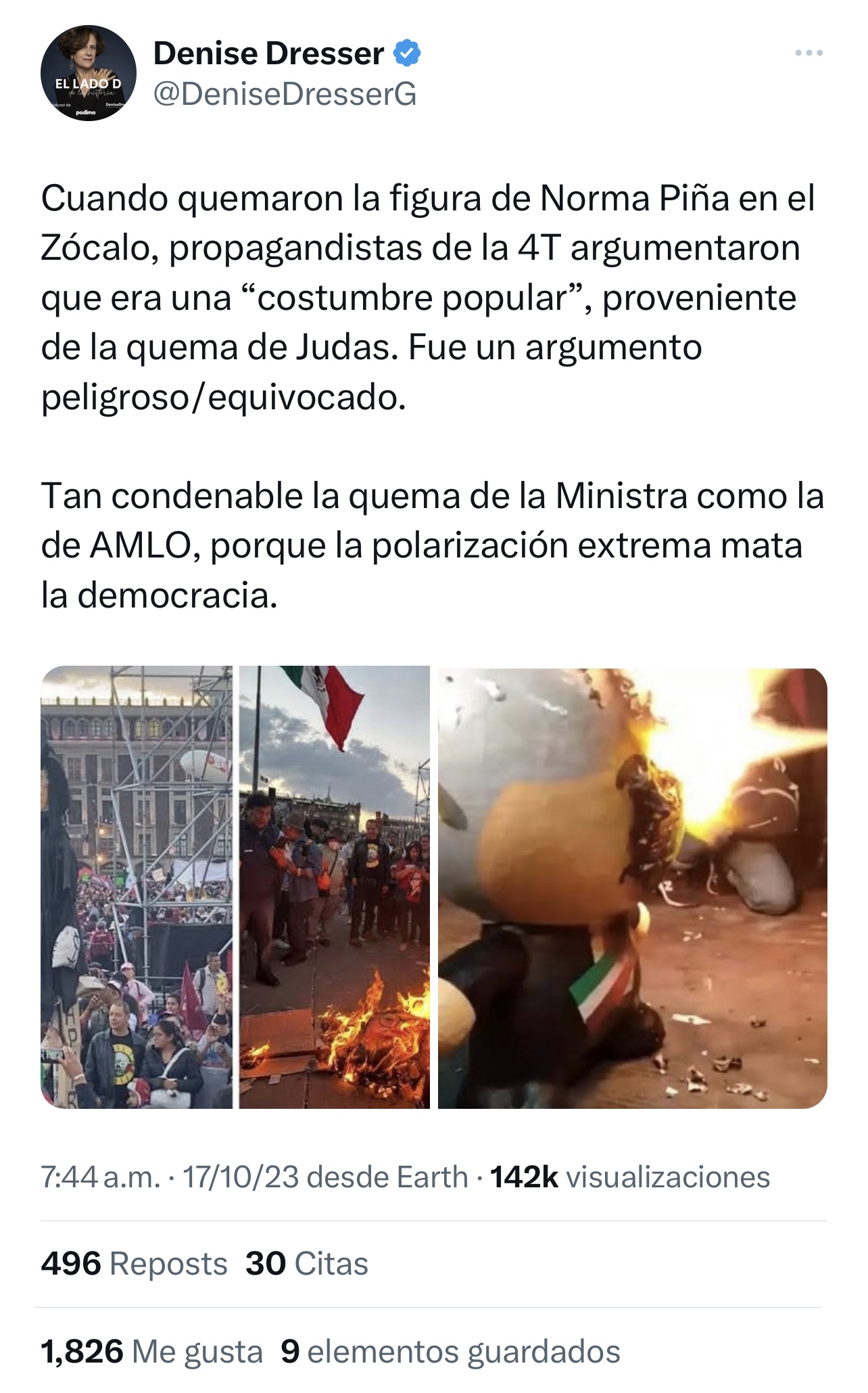 Por lo anterior, la también politóloga Dresser recordó en X, antes Twitter, que hace unos meses, en el Zócalo de la CDMX, simpatizantes de la Cuarta Transformación quemaron la figura de la ministra presidenta Norma Piña, bajo el argumento de que era una costumbre popular.