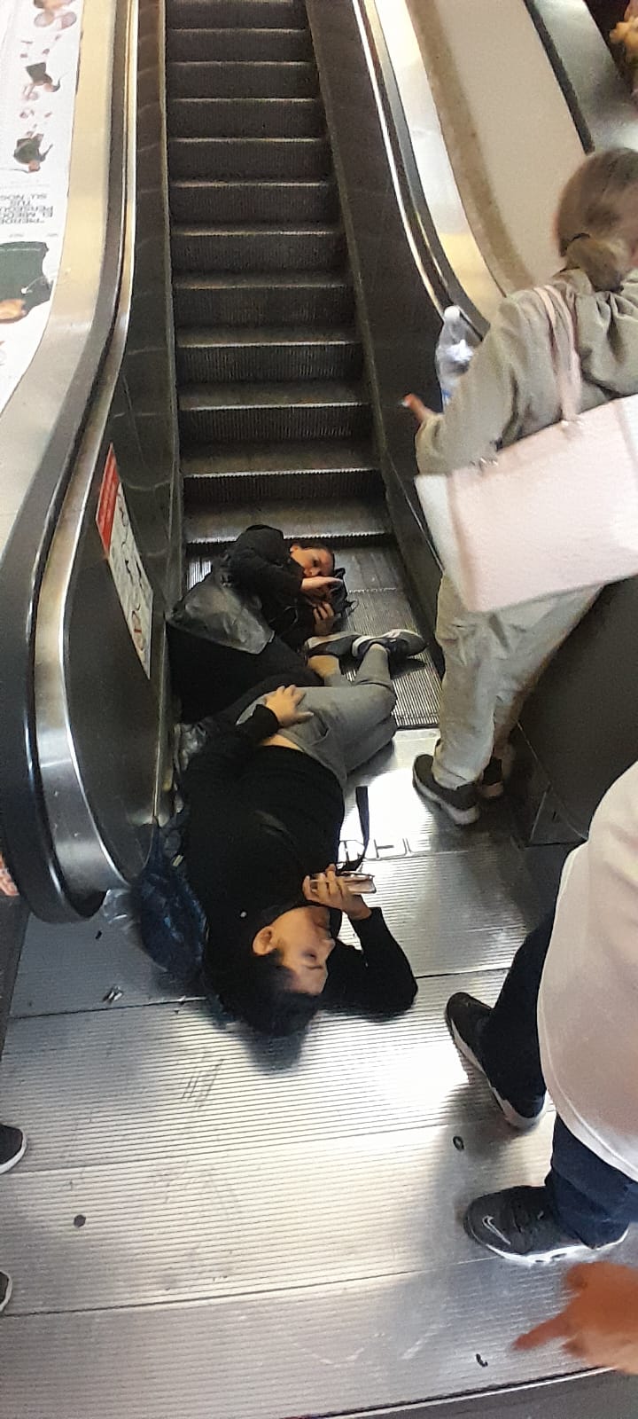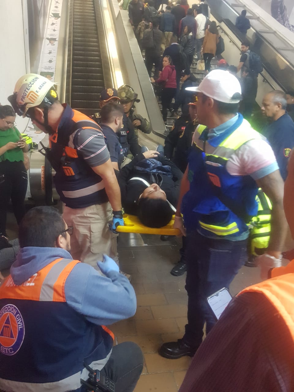 En el lugar se observaban a las personas afectadas tendidas en el piso a causa de la falla de las escaleras eléctricas, mientras otros usuarios tratan de levantarlas y brindarles auxilio.