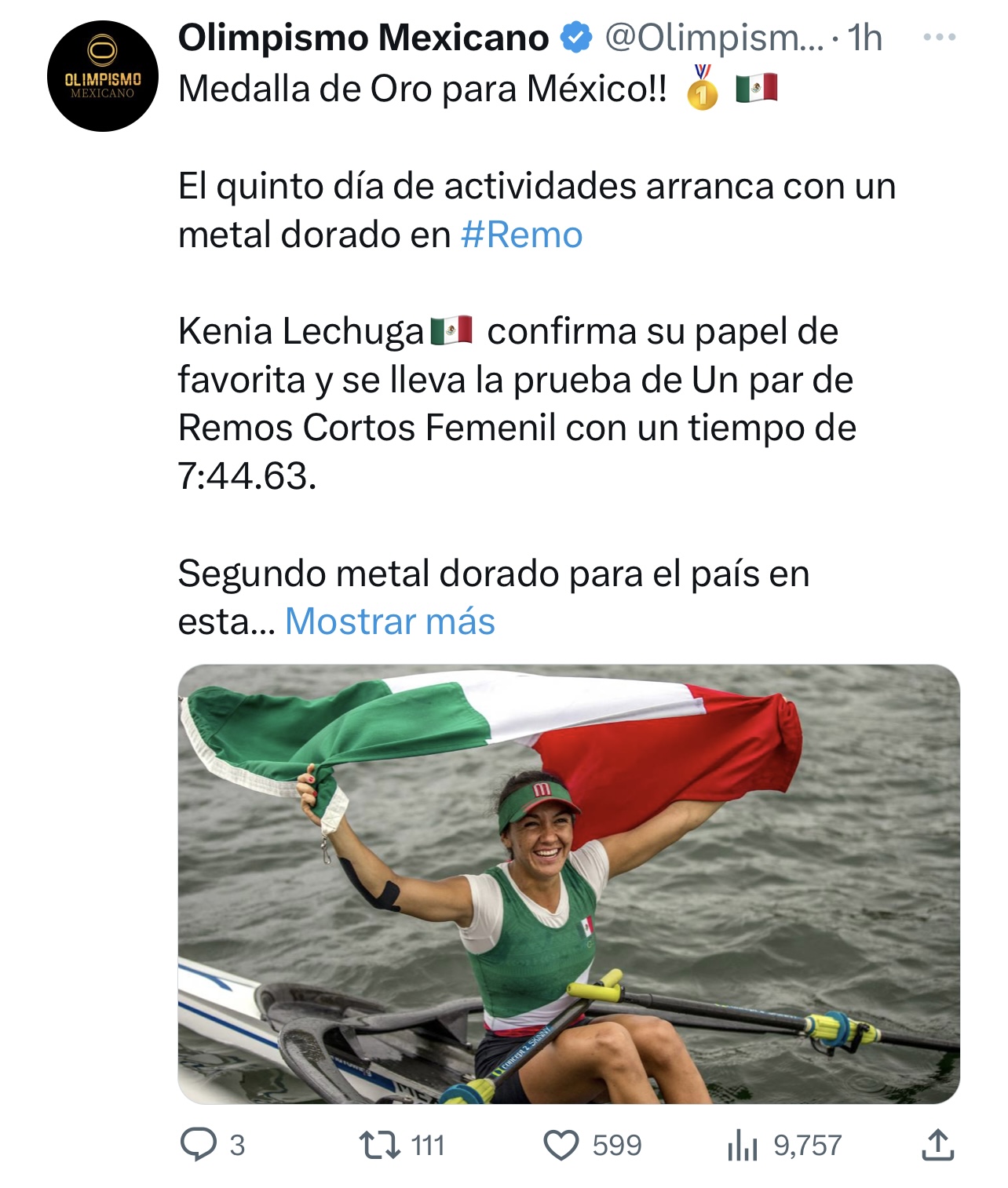 La medalla de oro de Lechuga es la número 23 para México en los Panamericanos, gracias a su triunfo en remo, modalidad de par cortos femenil