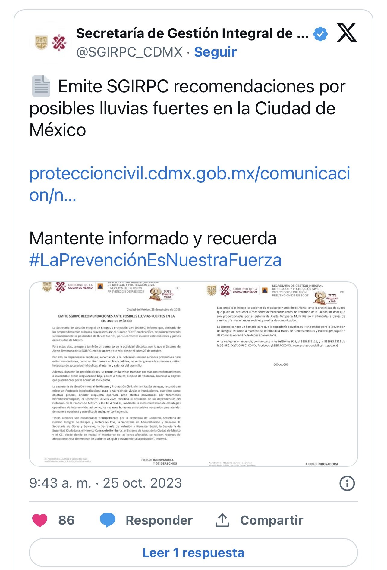 Protección Civil CDMX hizo un llamado para que la ciudadanía actualice su Plan Familiar para la Prevención de Riesgos; así como a mantenerse informada a través de fuentes oficiales y evitar la propagación de información falsa o de dudosa procedencia.