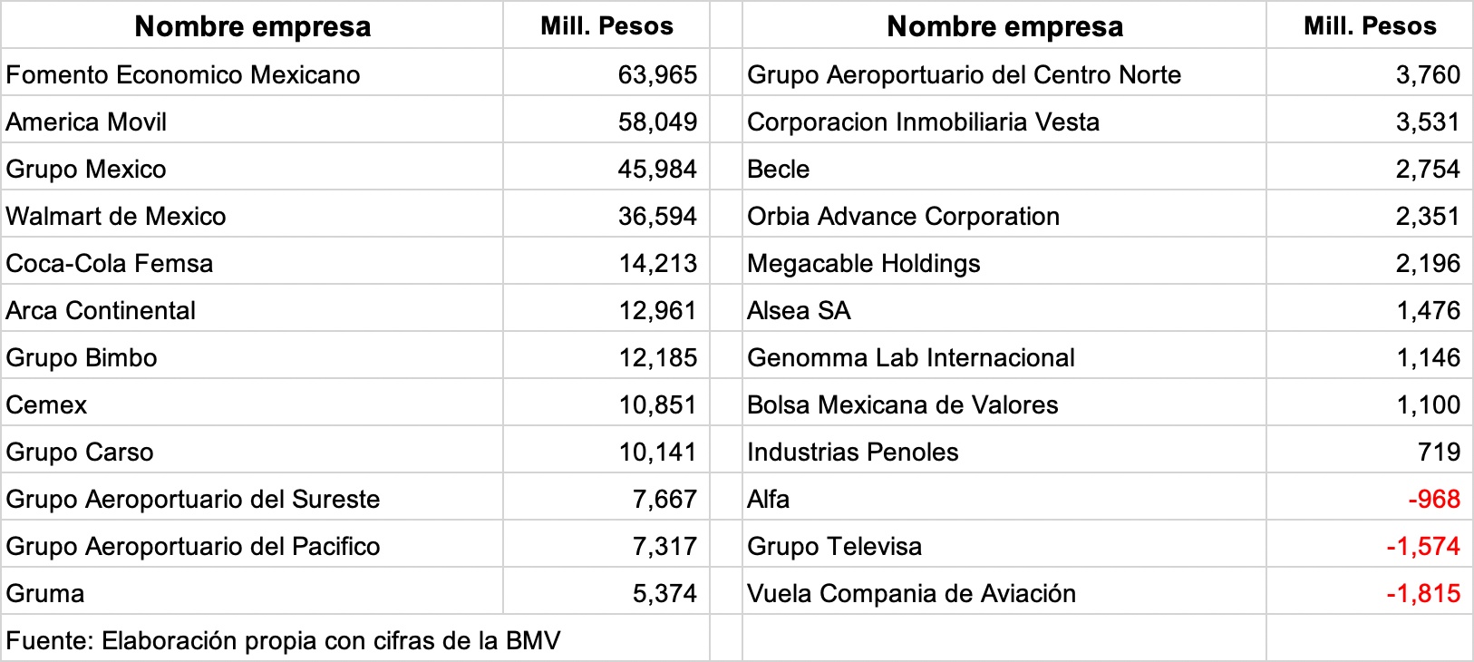 Existe una fuerte concentración en la generación de utilidades entre las empresas que cotizan en la BMV. FEMSA sola generó casi una quinta parte de los 327,365 millones de pesos, mientras que AMX representó el 18%, con lo que estas dos emisoras concentraron el 37% del total. Las 10 primeras emisoras generaron el 83% y se caracterizan también por ser las de mayor capitalización y bursatilidad, es decir, que son fácilmente comerciables, hecho que es de suma importancia en los periodos de volatilidad del mercado.