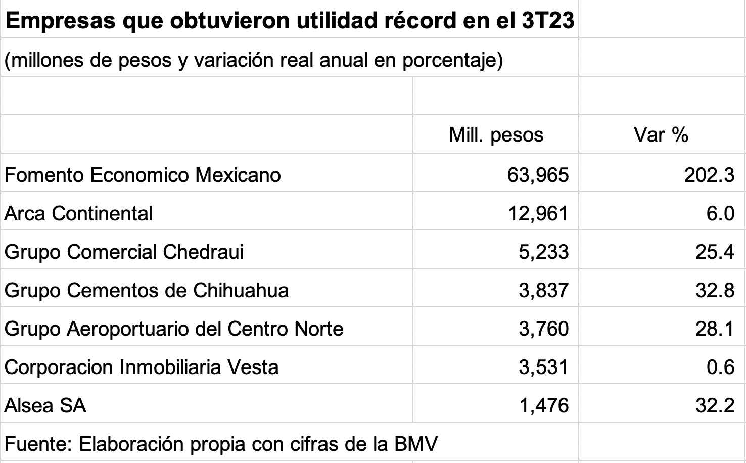 Fomento Económico Mexicano (FEMSA) con 63,965 millones de pesos lideró por monto a las empresas que obtuvieron el mayor volumen de utilidades en los primeros nueve meses del 2023, respecto al mismo lapso del año anterior. La multinacional mexicana fundada en Monterrey, Nuevo León, en 1890, que participa en la industria de las bebidas y en el sector comercial y de restaurantes, registró también la cifra más alta de utilidades en su historia.