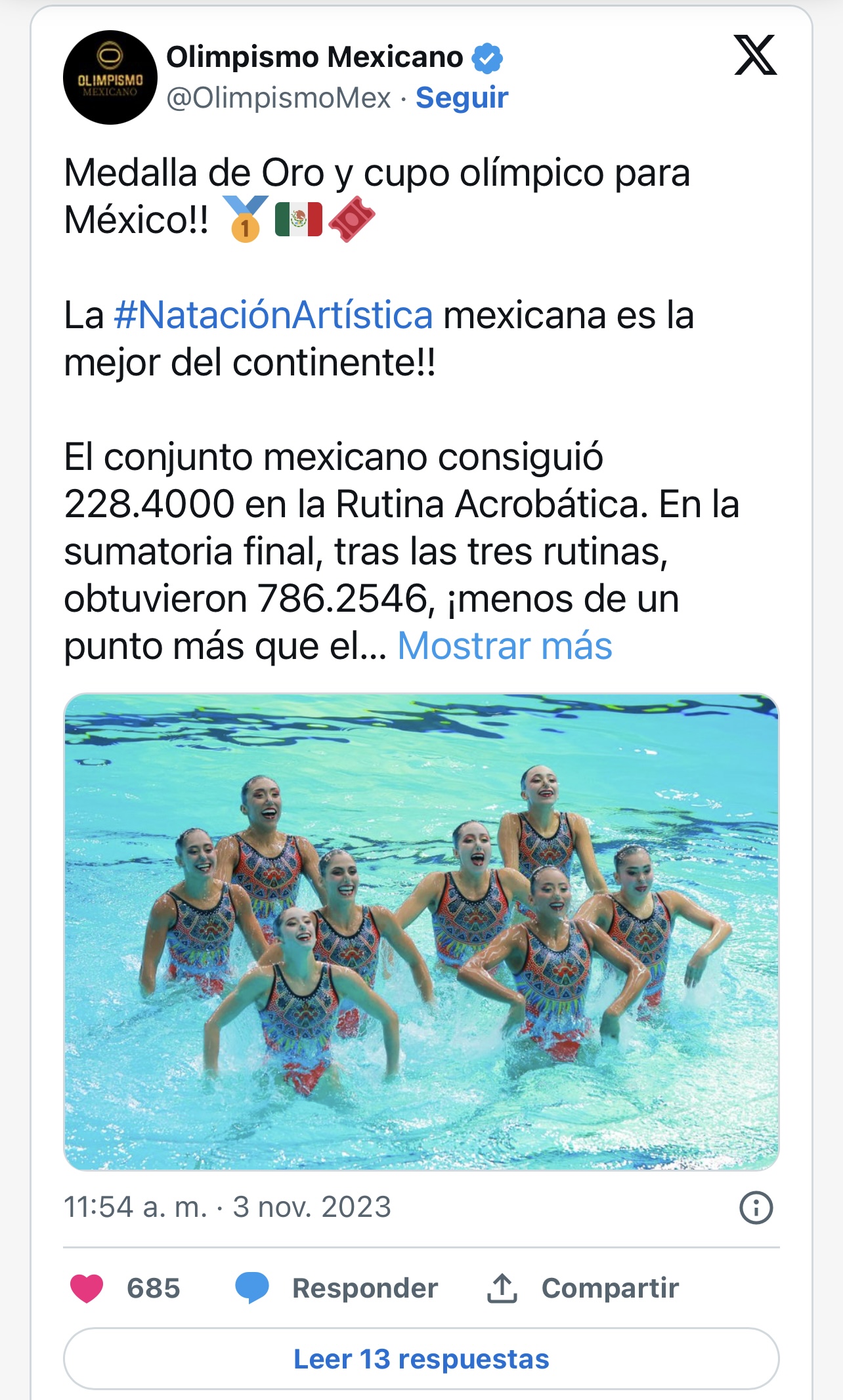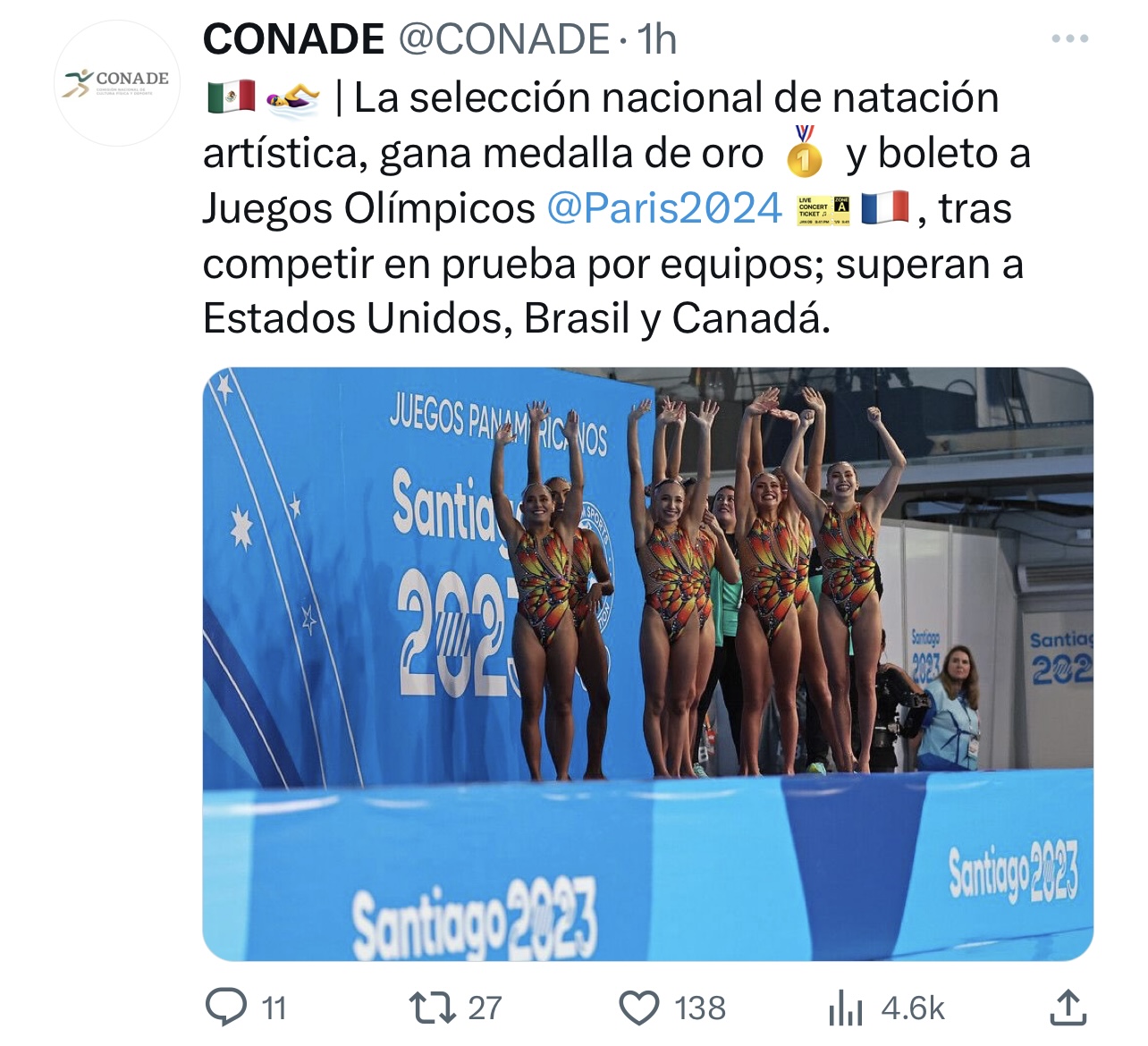 La Selección Mexicana de Natación Artística hizo historia en los Juegos Panamericanos Santiago 2023 al conquistar la medalla de oro en la prueba por equipos y de paso asegurar su boleto a los Olímpicos de París 2024.
