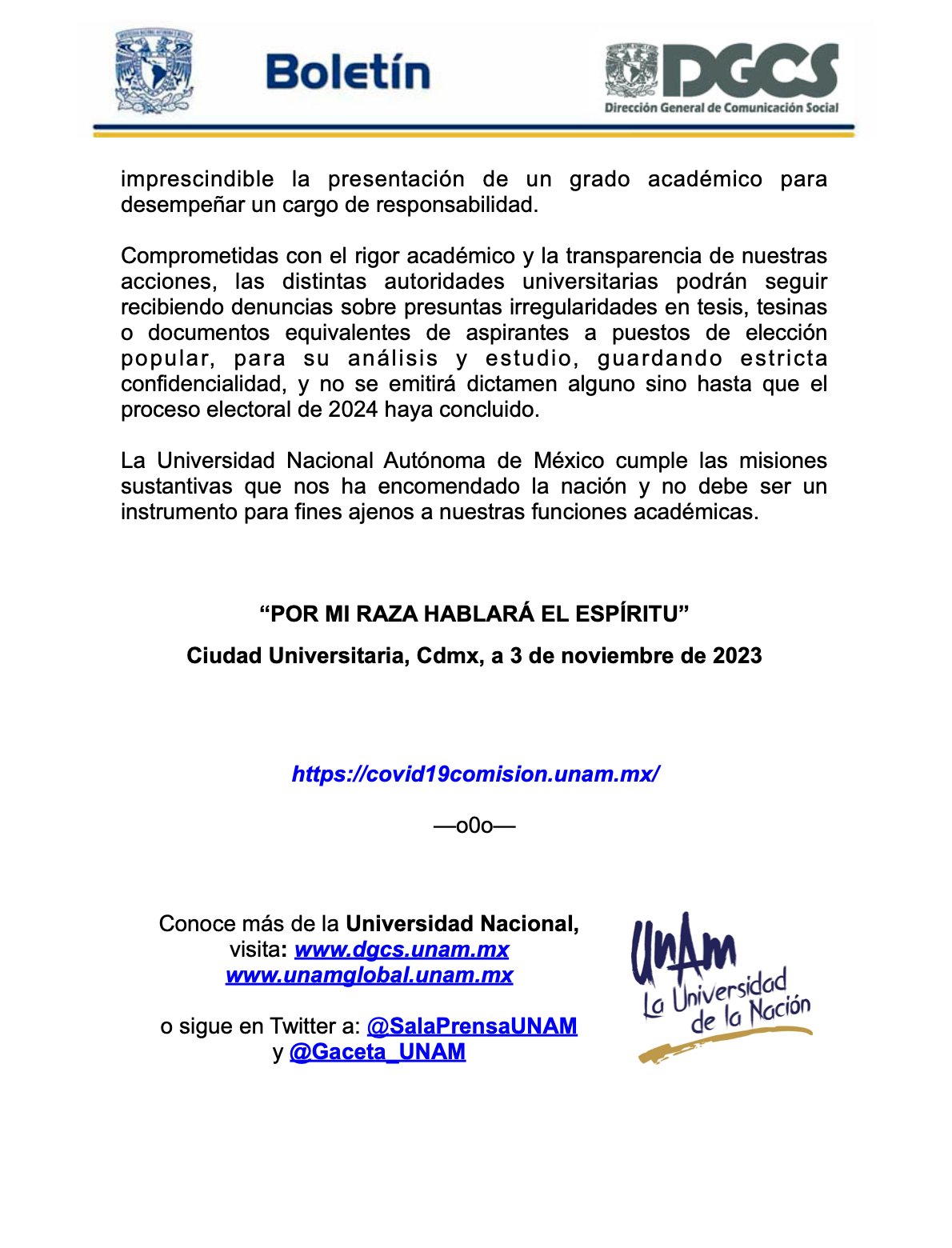En el mismo comunicado, la máxima casa de estudios reiteró su compromiso con la honestidad académica de sus estudiantes, académicos y egresados. Al tiempo que entiende que los casos antes referidos son de figuras públicas y que las denuncias sobre las supuestas irregularidades están enmarcadas dentro de la contienda político-electoral del próximo 2024.